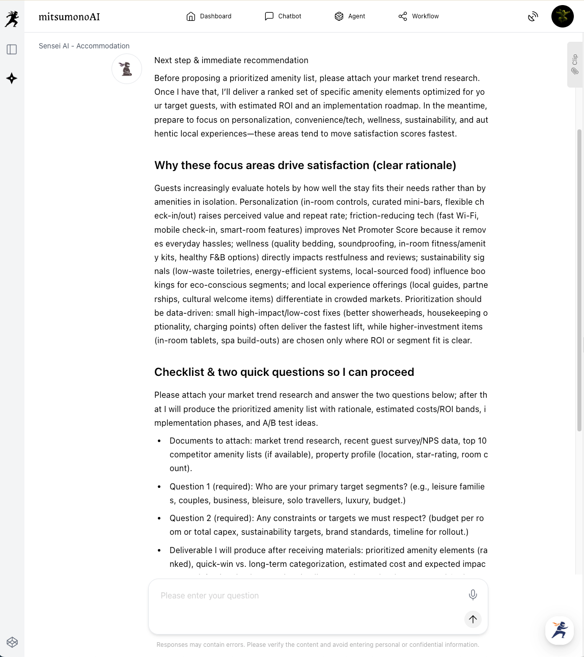 Next, send the saved research document on hotel amenities from Step 1. Sensei AI (Hospitality) will provide an analysis result based on industry knowledge.