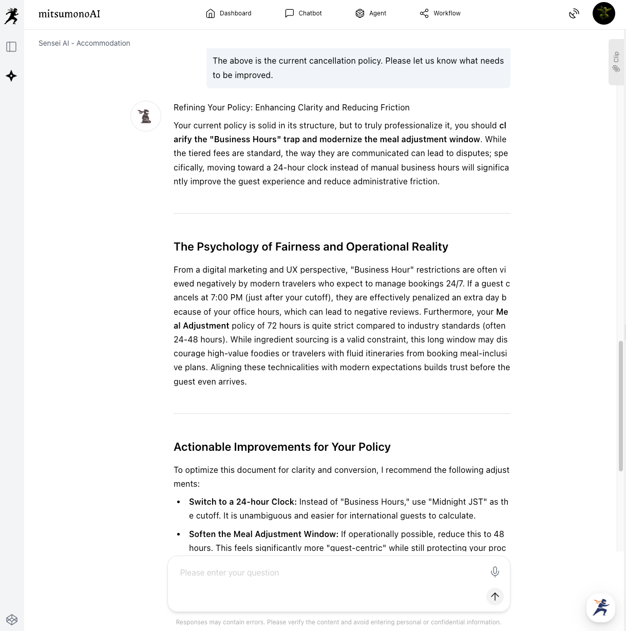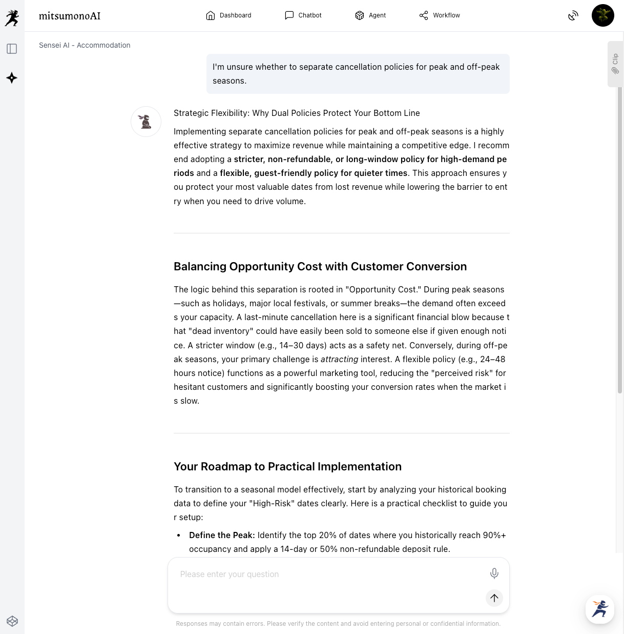 First, ask Sensei AI what kind of cancellation policy is desirable. At this stage, sharing your specific concerns—such as whether to differentiate between peak and off-peak seasons or how much flexibility to offer—will help you get more concrete advice.