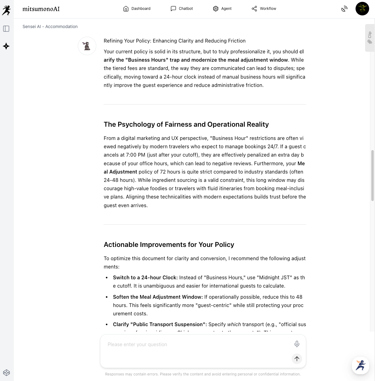 Next, submit your current cancellation policy and have the AI provide a rigorous evaluation. The AI will check the balance of profitability, fairness, and guest acceptance against historical data and industry standards to identify areas for improvement.
