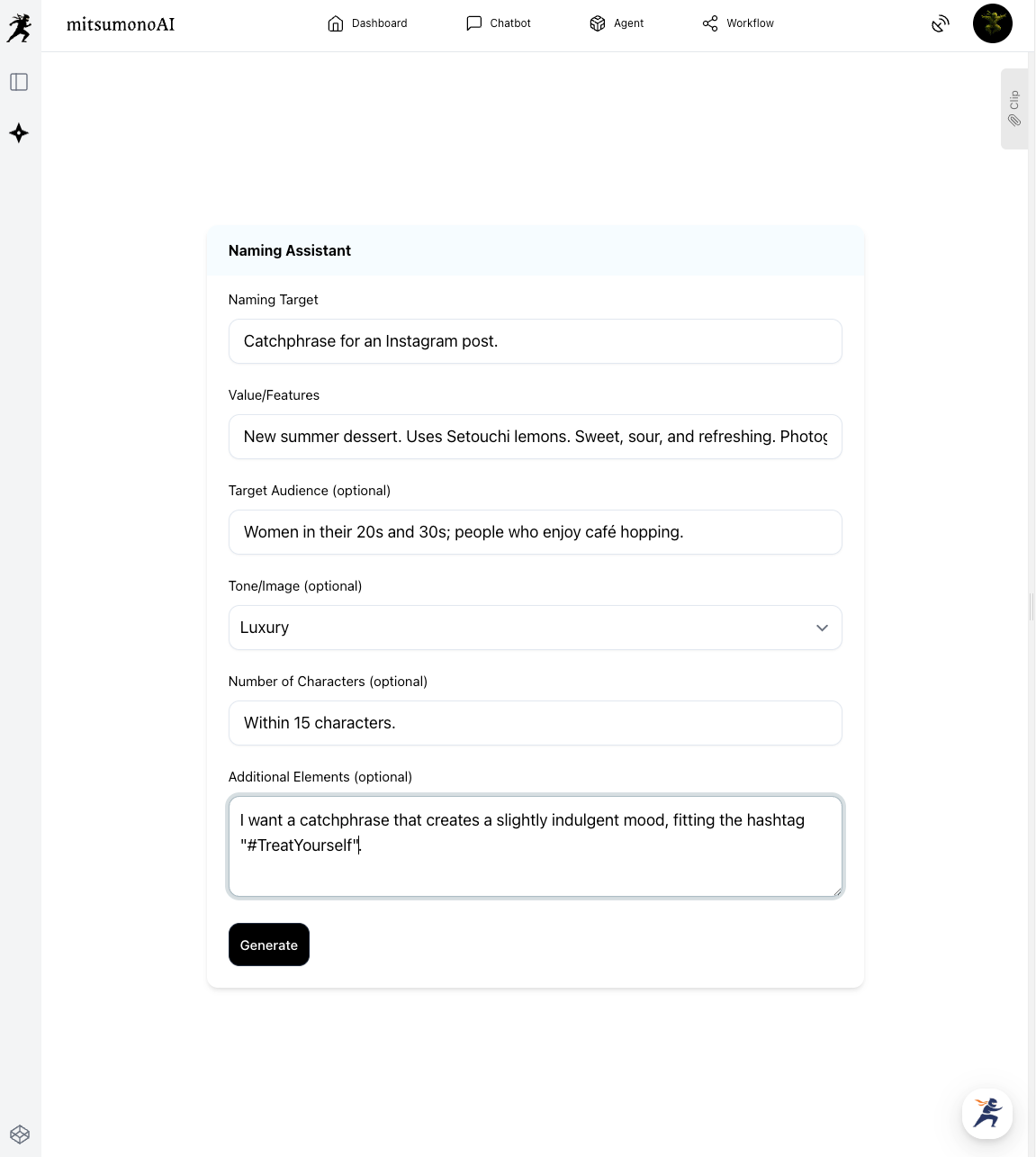 The biggest key is to "re-interpret" and input the fields of this tool as "requirements for creating a catchphrase," which will make the AI start generating compelling sentences that capture people's hearts instead of product names.
