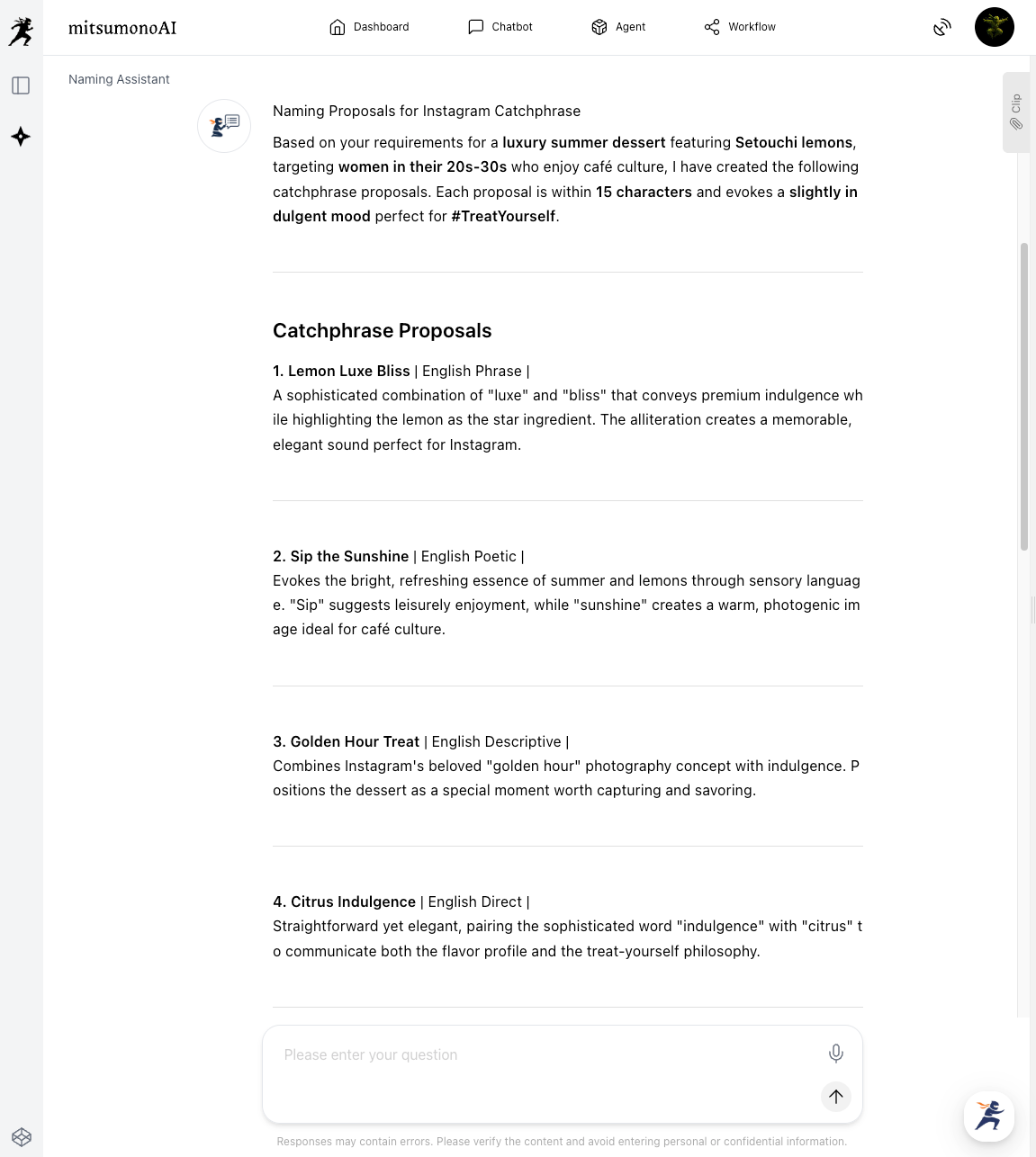 This "re-interpreted" input allows the AI to propose multiple catchphrase ideas that are most likely to move users' hearts, all within the specified conditions.