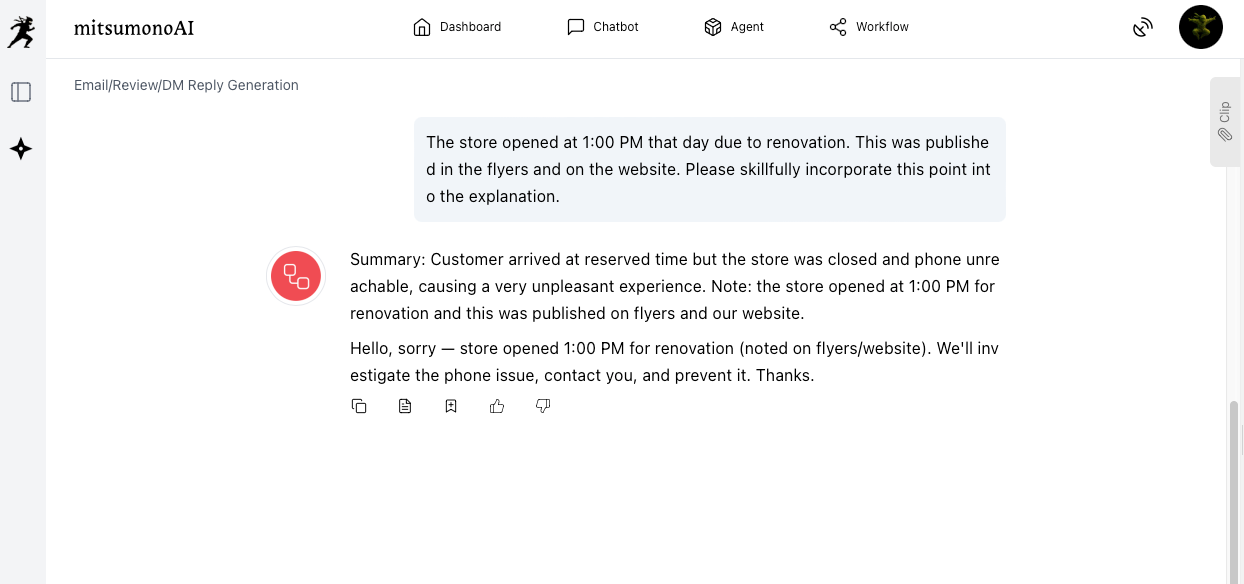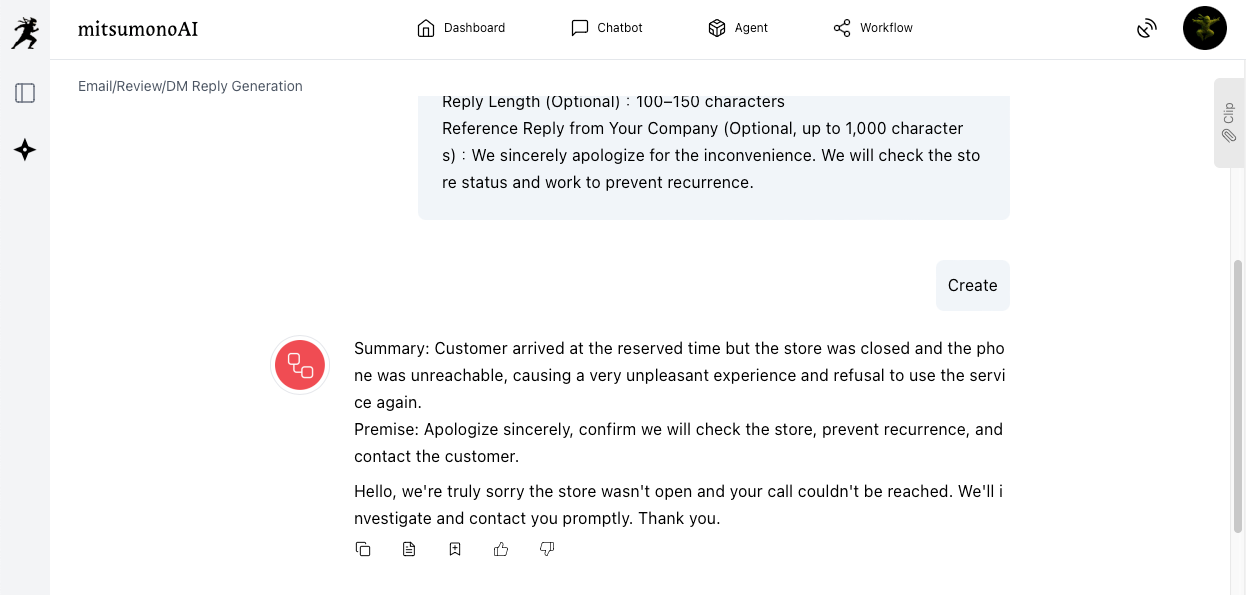 In such situations, leveraging AI can smoothly handle everything from content analysis to drafting a calm response. This makes it possible to appropriately convey a company's sincere attitude while preventing emotional disputes.