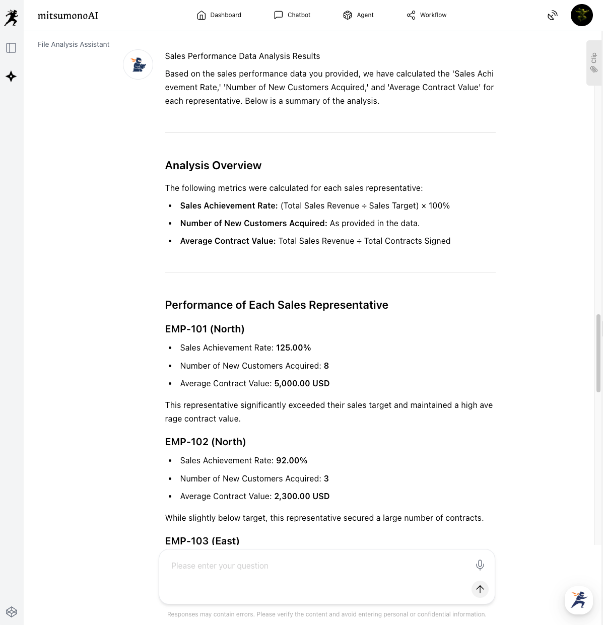 This is where objective data analysis by AI comes in handy. Simply upload employee sales performance, attendance data, and other records to the "File Analysis Assistant," and the AI will analyze the figures from an impartial perspective and automatically create a draft evaluation.