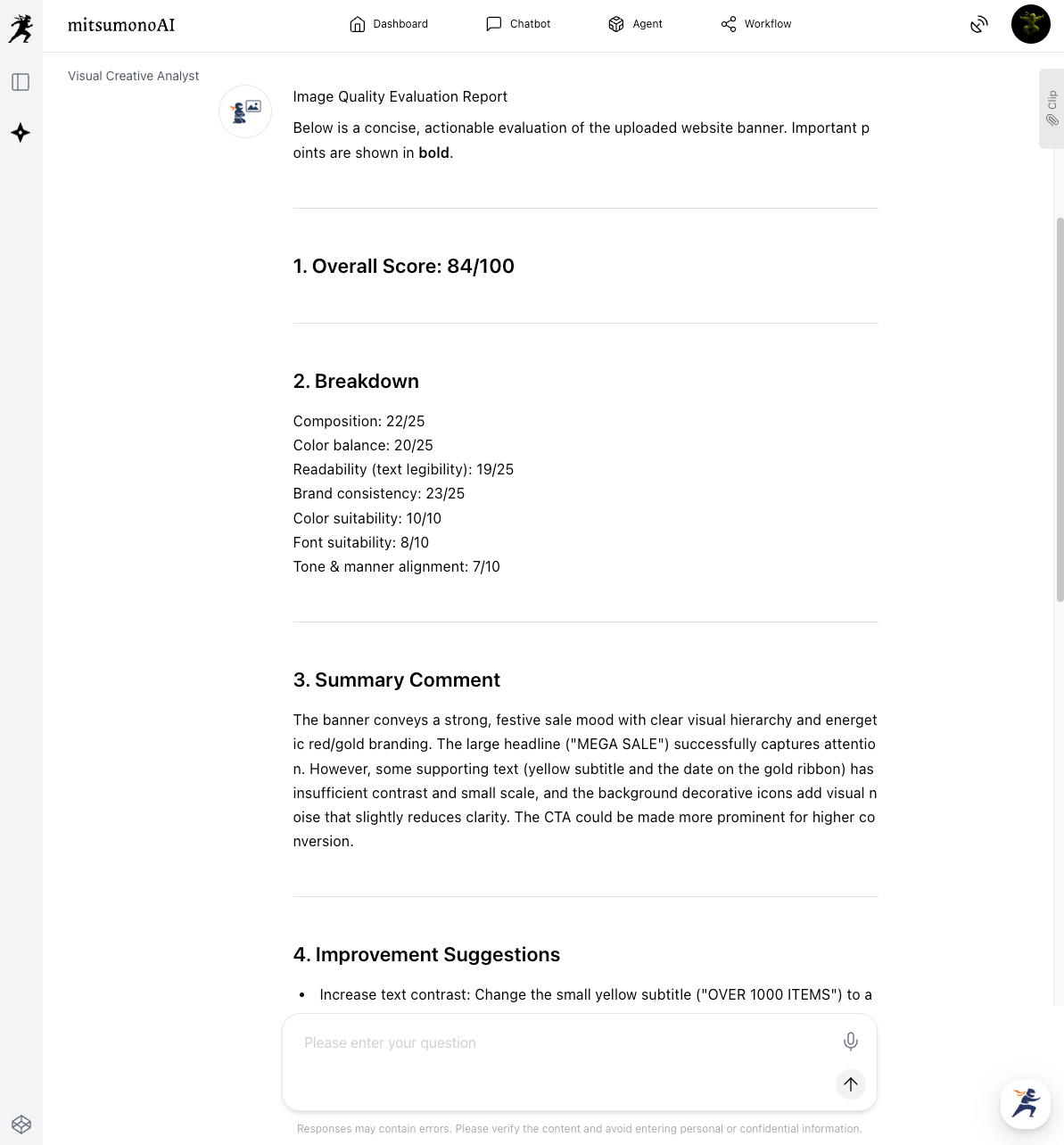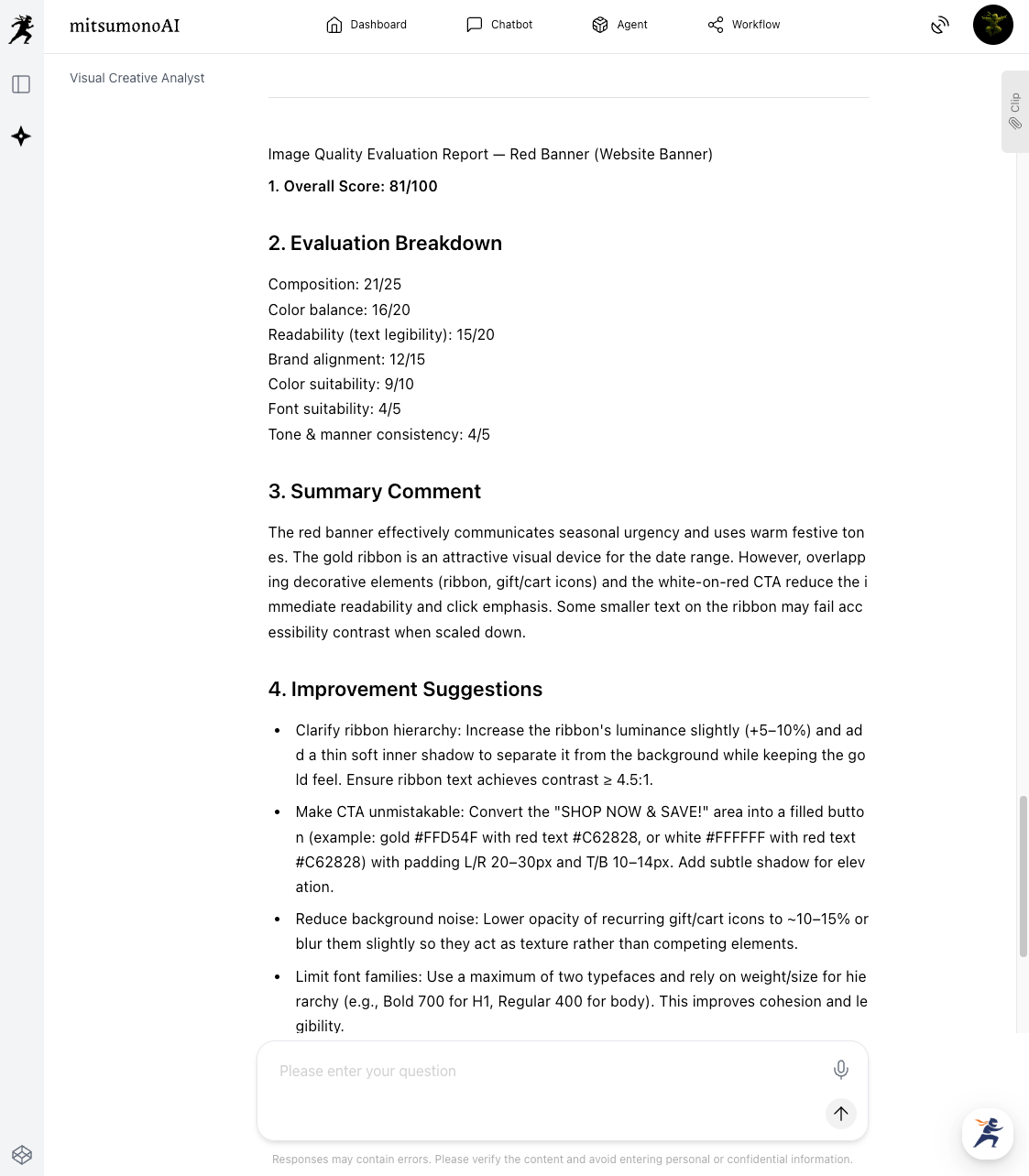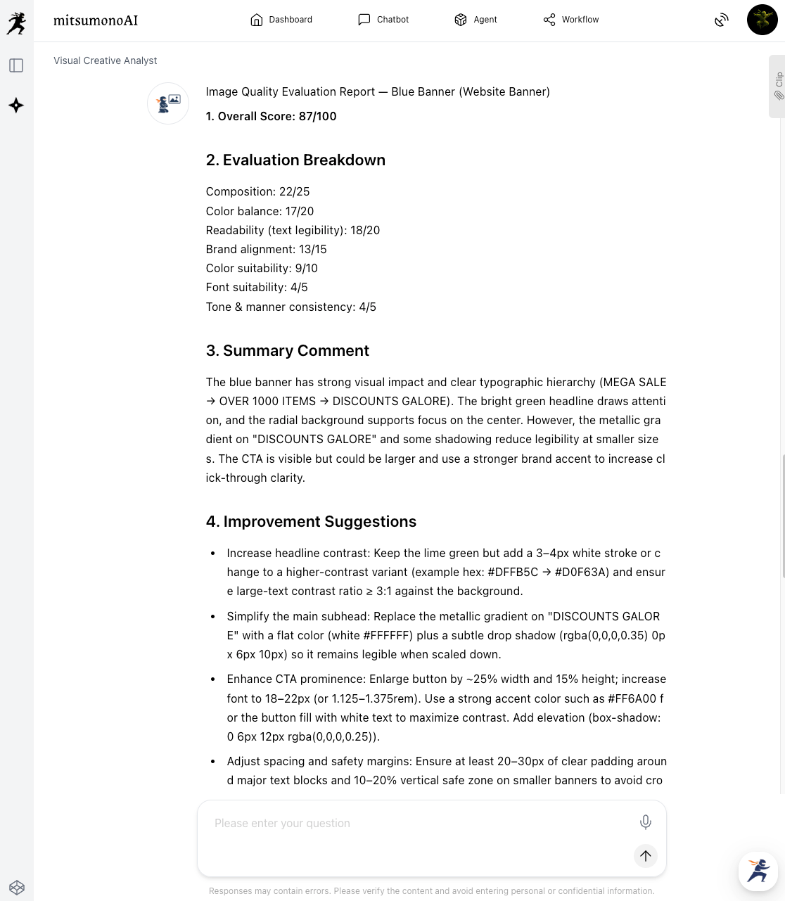 Simply upload your design proposals, and the "Visual Creative Analyst" instantly performs a weakness analysis and proposes multiple improvement suggestions.