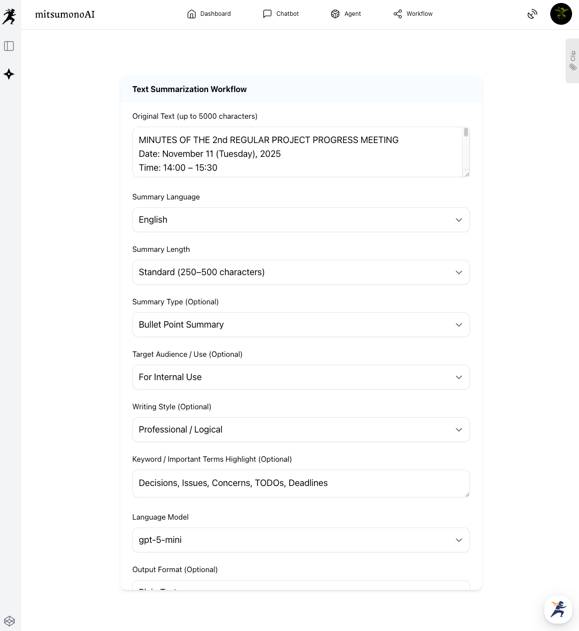 Launch the Text Summarization Workflow, paste the email or chat log into the "Original Text" field, and specify the output format.