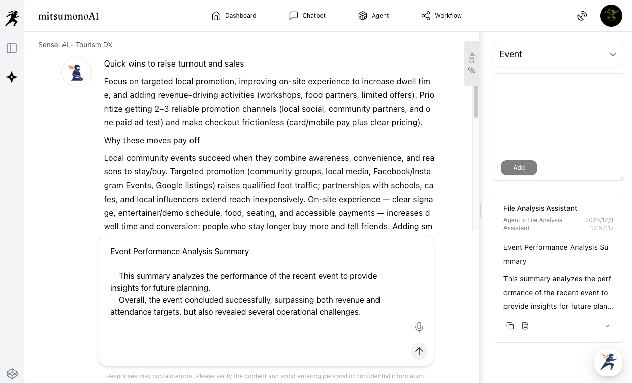 This article introduces a concrete method for using the "File Analysis Assistant" and "Sensei AI - Tourism DX" to objectively analyze event performance based on data and utilize it for planning and improving future events. Let's use AI effectively to maximize the ROI (Return on Investment) of your events and deploy more effective marketing strategies.
