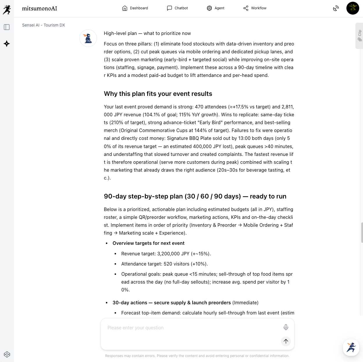 Sensei AI will propose specific measures for improving attendance, increasing revenue, and enhancing operational efficiency for the next event, as well as points to note during the planning process, based on the submitted analysis data.