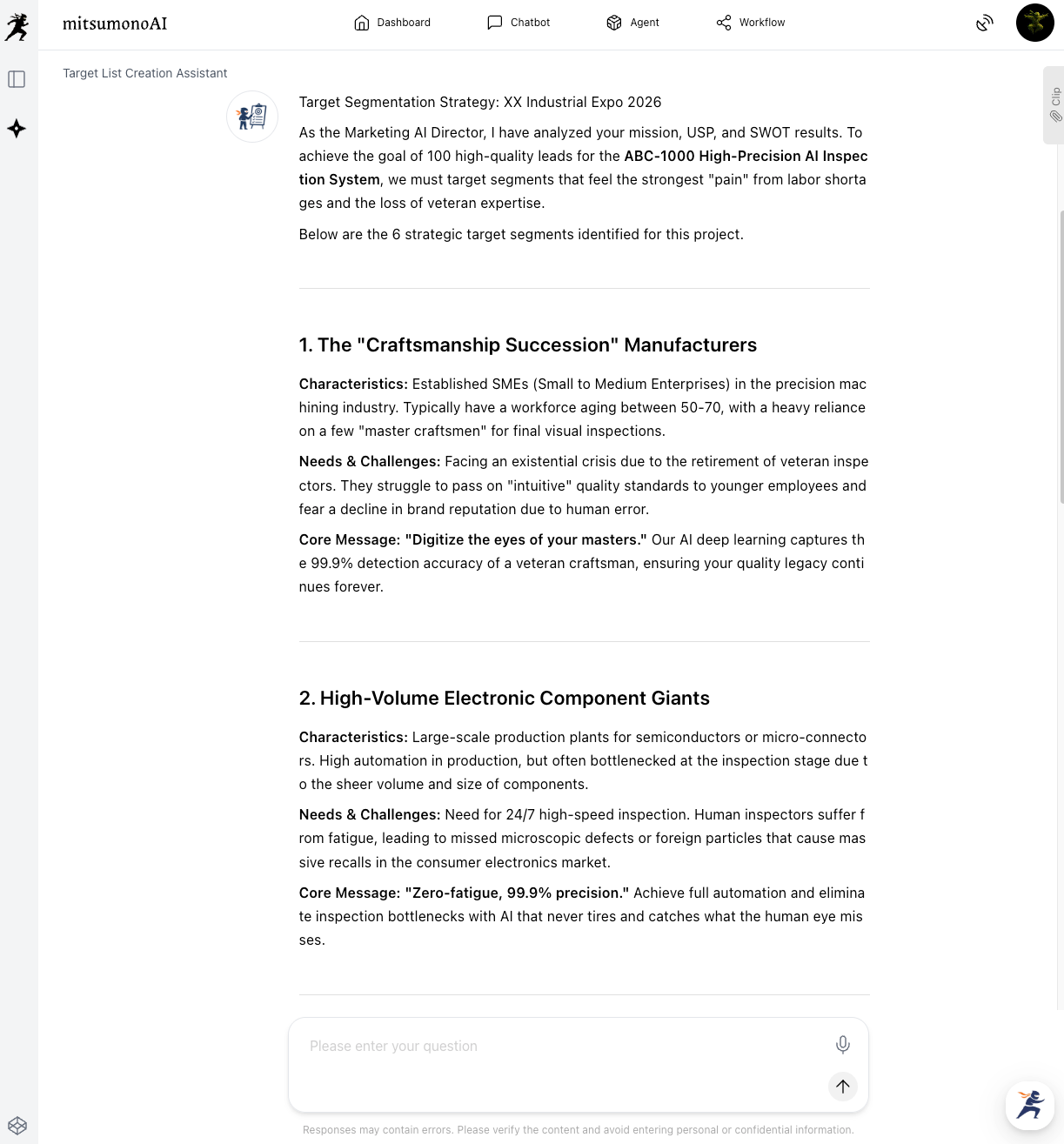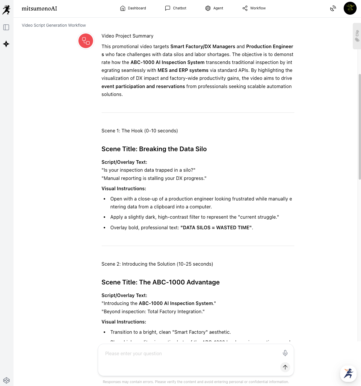 Based on your company's strengths and the exhibition theme, this tool automatically lists specific visitor personas—detailing their roles and the challenges they likely face. - Video Script Creation Workflow: