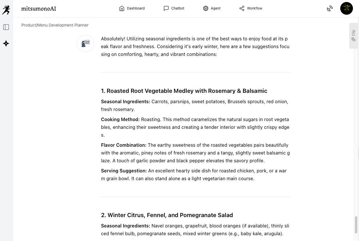 Example Prompt:"We want to prioritize the concepts of 'healthy' and 'additive-free.'""Do you have any suggestions for cooking methods or combinations that utilize seasonal ingredients?"