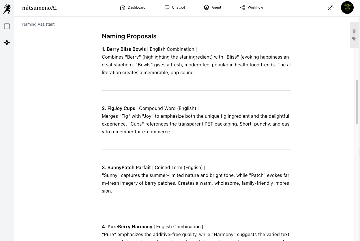 By inputting the product overview and the elements you want to emphasize, the AI will propose multiple name candidates. You can narrow down the candidates while checking if the names are practical and don't overlap with competitors.