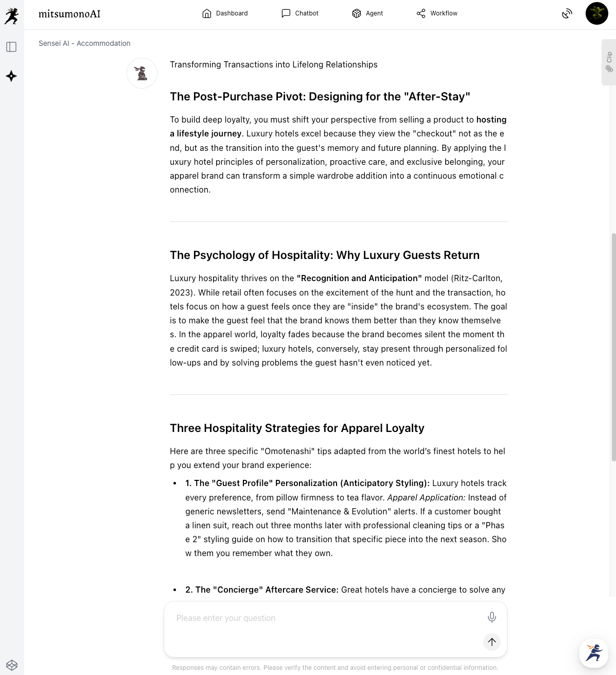 Select a Sensei AI from a different industry via the mitsumonoAI chat function (e.g., select Sensei AI - Accommodations).