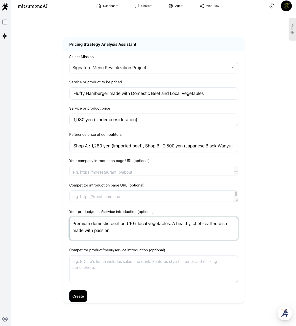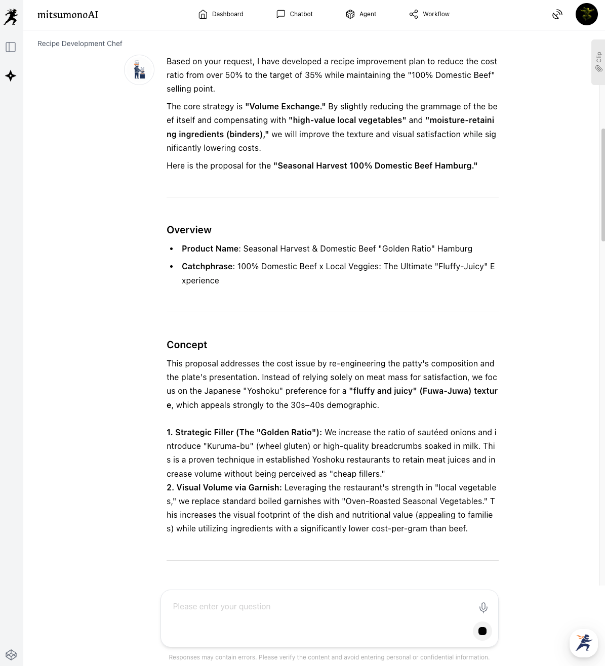 To solve this deep-seated issue, mitsumonoAI provides two powerful AI assistants that bridge the gap between recipe development and pricing strategy.