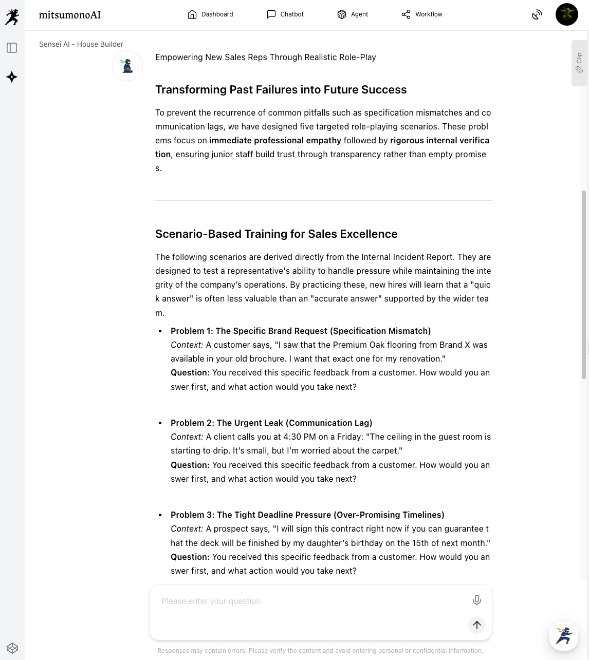 Finally, input the extracted failure cases into the industry-specific Sensei AI - Home Builder to create practical role-playing problems.
