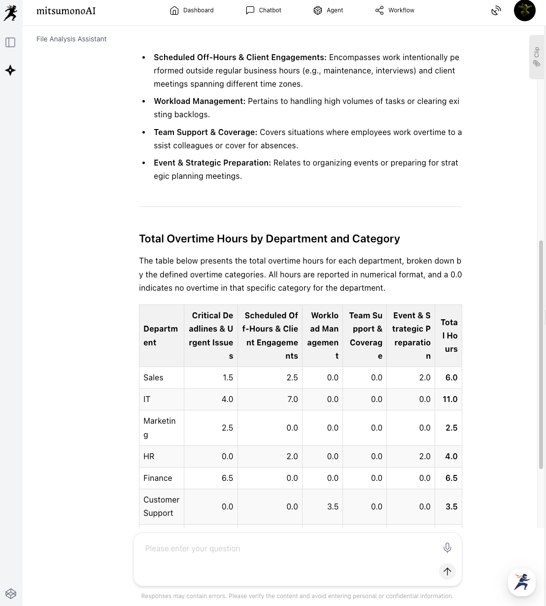 AI simultaneously reads "structured data" such as overtime hours and department names, and "unstructured data" such as free-text reasons for overtime. It objectively identifies overtime patterns by department, making it clear which department is generating how many hours of overtime for what reasons. - Removing Subjective Bias: Objective Categorization of Reasons