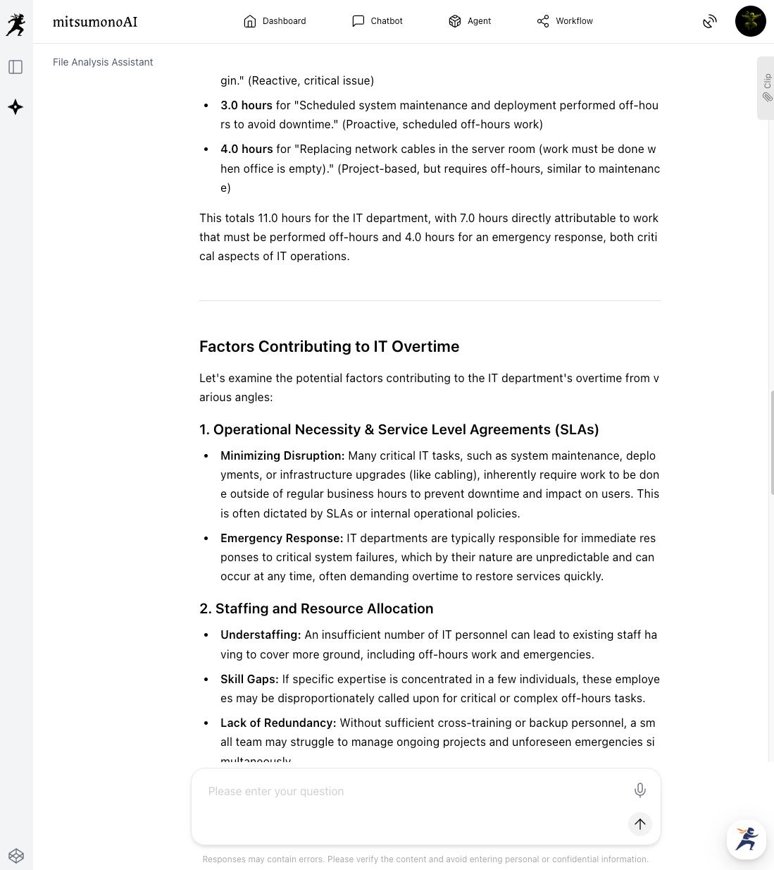 This article introduced the steps to identify root causes from overtime data and derive concrete solutions using mitsumonoAI's "File Analysis Assistant." Utilizing AI enables: