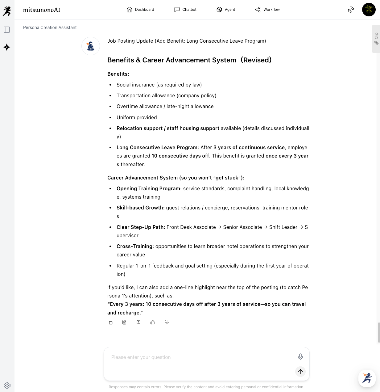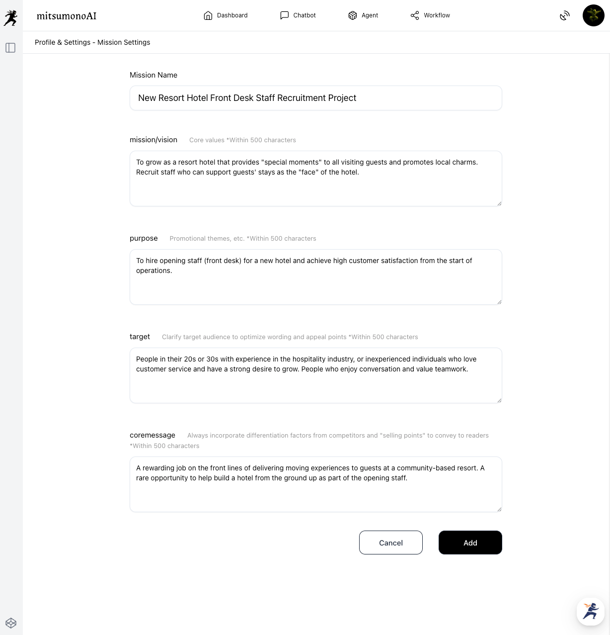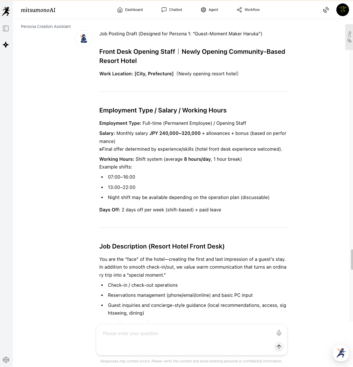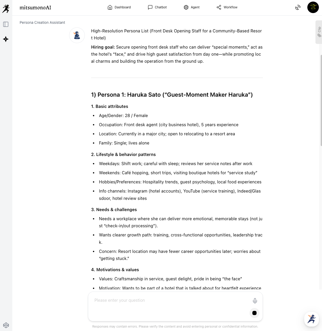 Clearly communicate the purpose and background of your recruitment to the Persona Creation Assistant. In this example, we will register a specific mission for hiring front desk staff for a new resort hotel.