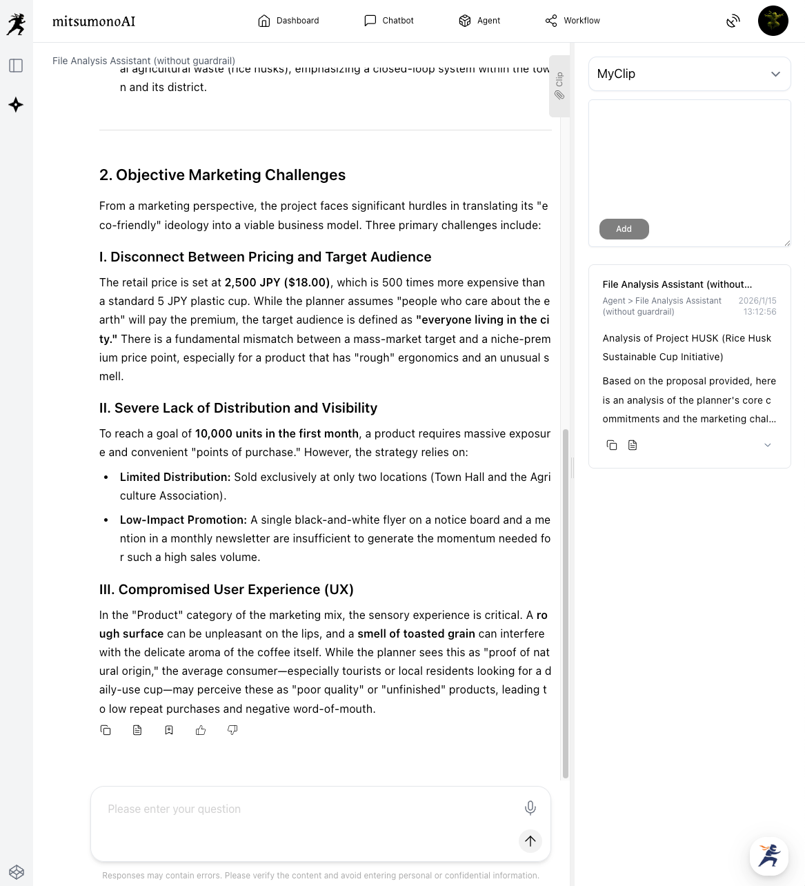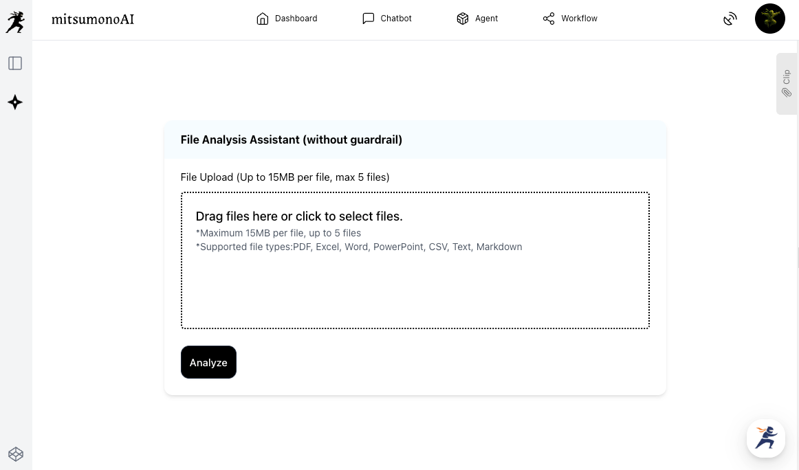 First, upload the past proposal (Word, PDF, etc.) to mitsumonoAI’s "File Analysis Assistant."