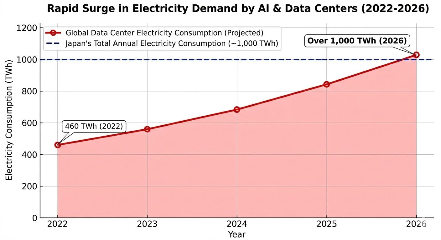 According to forecasts by the International Energy Agency (IEA), electricity consumption by data centers, AI, and the cryptocurrency sector is expected to exceed 1,000 TWh (terawatt-hours) globally by 2026. This 1,000 TWh figure is roughly equivalent to the annual electricity consumption of the entire nation of Japan. Considering that consumption was approximately 460 TWh in 2022, demand is set to double in just a few years. AI has moved beyond the realm of software, strengthening its aspect as a massive physical industry requiring enormous amounts of energy.