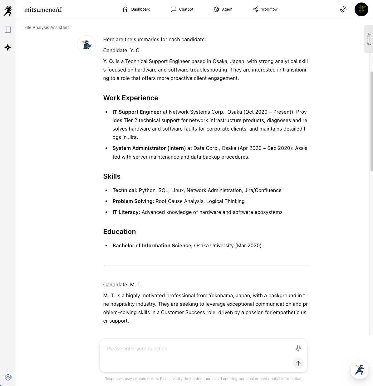 Document screening, especially when there are many applications, is one of the most time-consuming tasks. By uploading resumes and curriculum vitae (PDF, Word, etc.) in bulk and instructing criteria such as required skills and years of experience, the AI instantly lists candidates who meet the conditions.