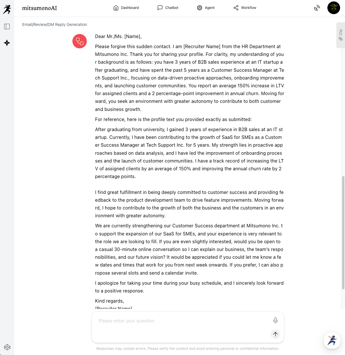 Communication with candidates, such as sending scout emails and coordinating interview schedules, requires both speed and politeness. By using the "Email/Review/DM Response Generator," you can instantly create email content tailored to the recipient.