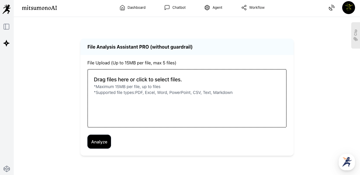 Launch File Analysis Assistant PRO. Upload "inquiry email log files" (text or CSV) automatically saved by RPA, or "daily report files" (PDF/Word) compiled by staff. This method allows you to analyze and structure dozens of inquiries at once, significantly improving operational efficiency compared to manual copy-pasting.