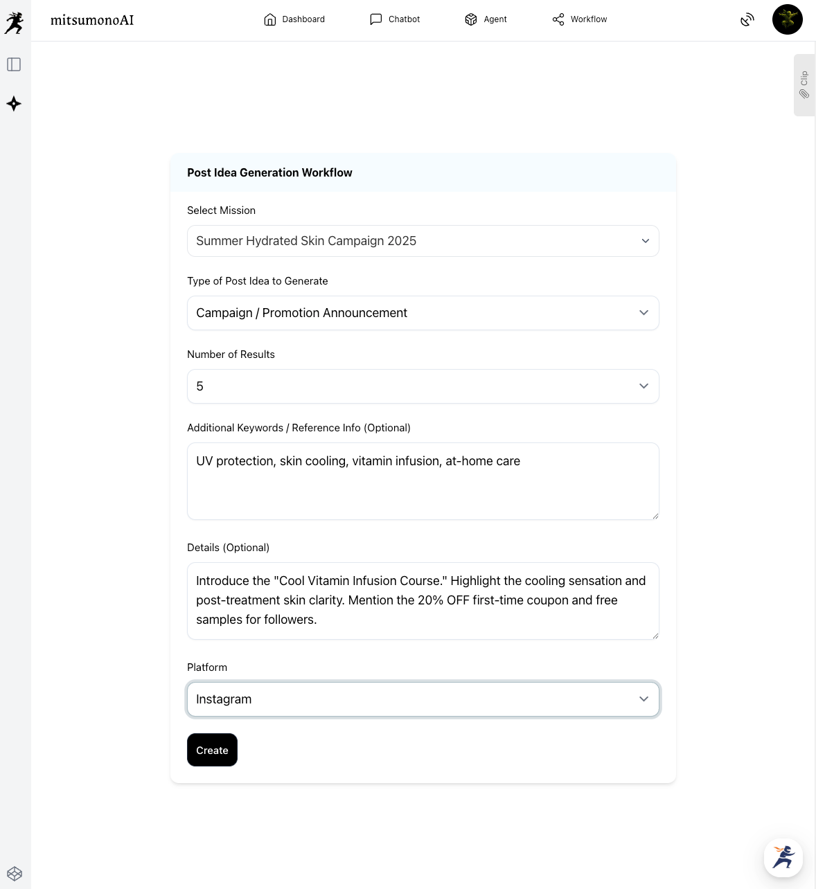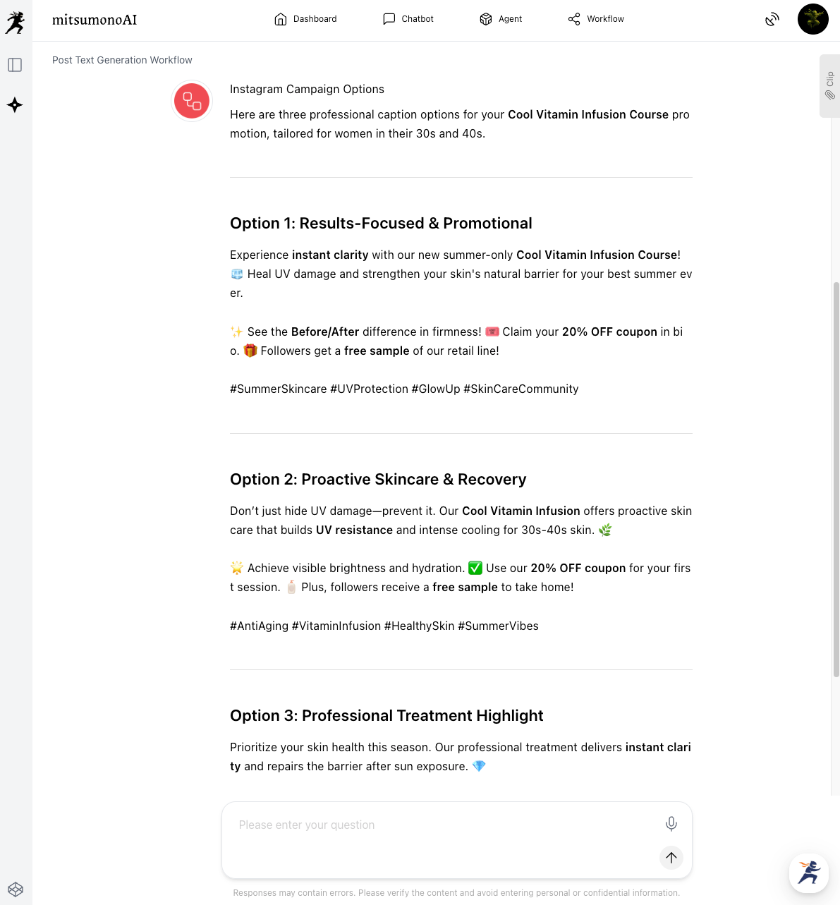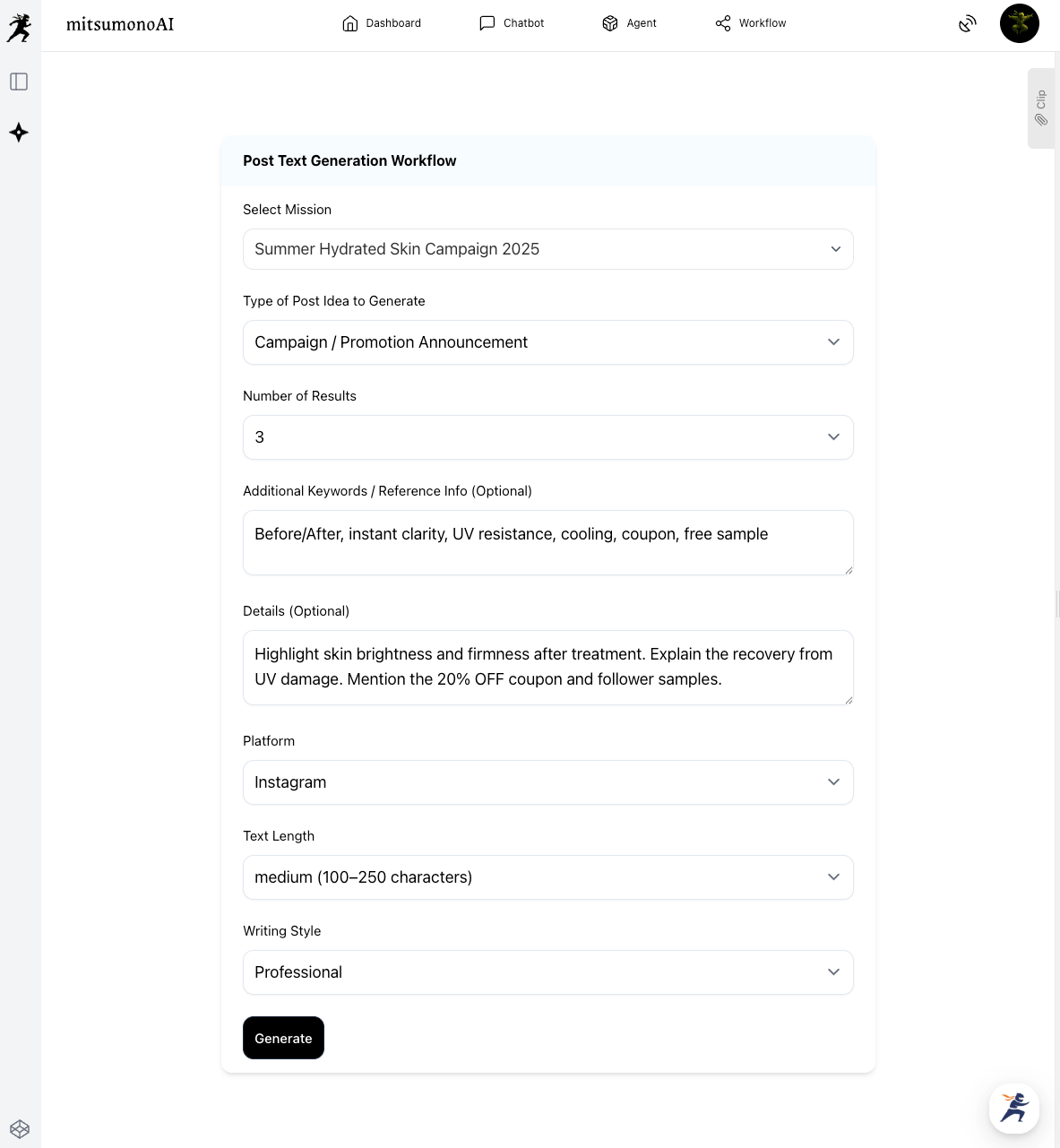 Next, choose your favorite idea and use the Post Caption Creation Workflow to generate the actual text. Let’s try creating one from the idea "Before & After: Instant Clarity."