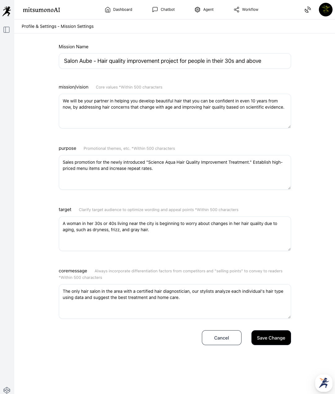 Open "My Mission" in the mitsumonoAI settings and enter your shop’s philosophy and target audience. (In this example, we use a hair salon).