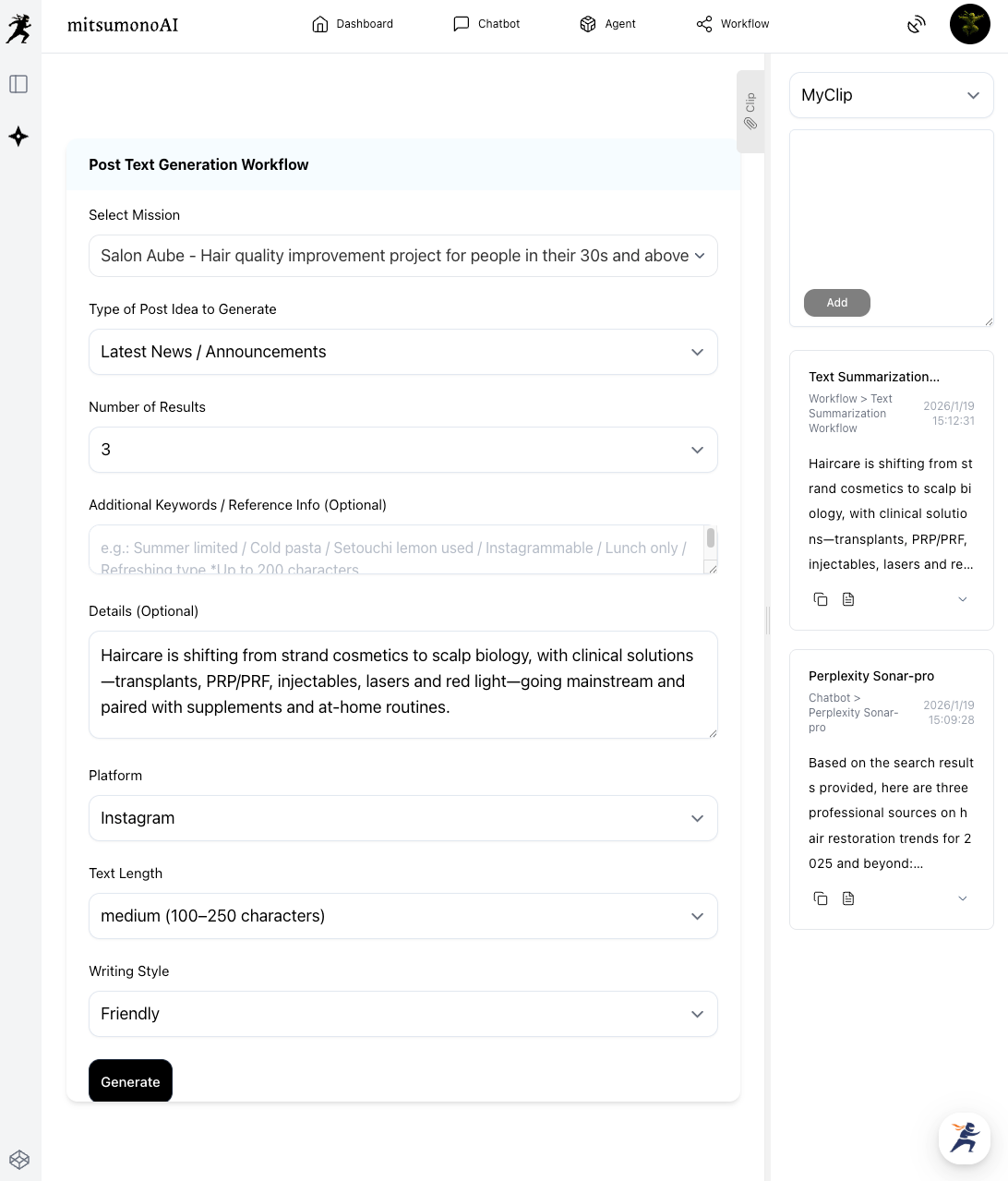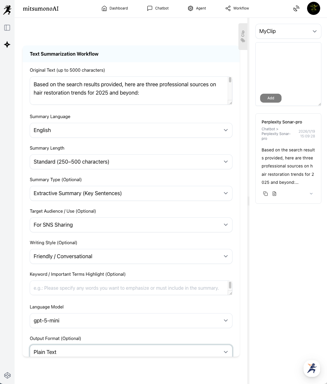Through this step, a complex and technical long-form article is transformed into the "core" of a post that is easy for target customers to understand and find interesting. Save the result using the "Clip" feature for the next step.