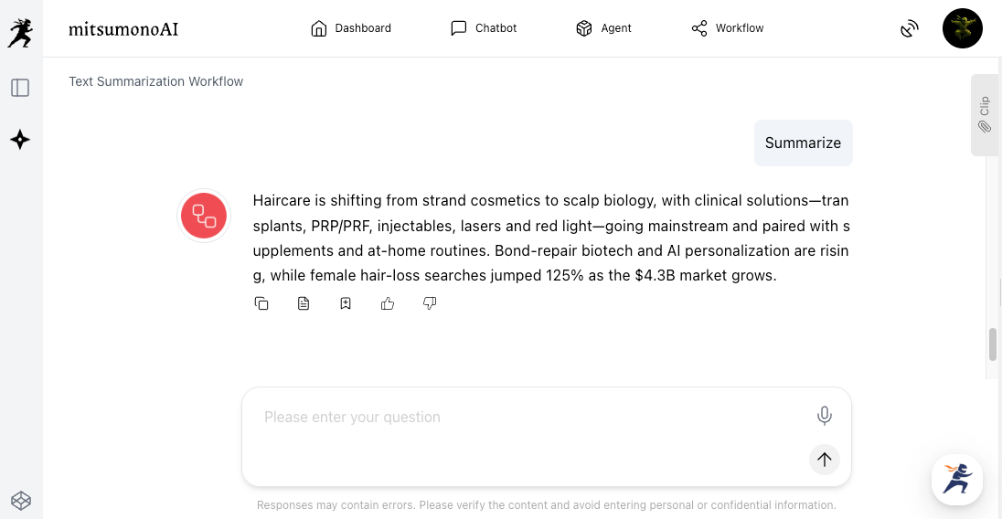 Organizing Key Points with Text Summarization Workflow Copy the full text of an article you want to dive deeper into from the AI Chat results and paste it into the Text Summarization Workflow.