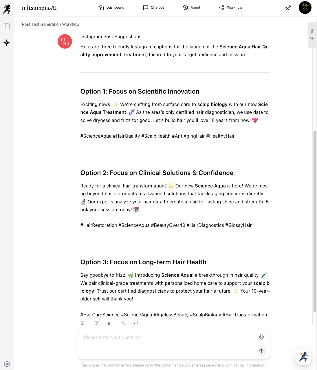 This step produces multiple patterns of posts that are professional yet empathetic to the target's concerns, complete with optimized emojis and hashtags (e.g., #HairRestoration #AntiAging #GlossyHair).