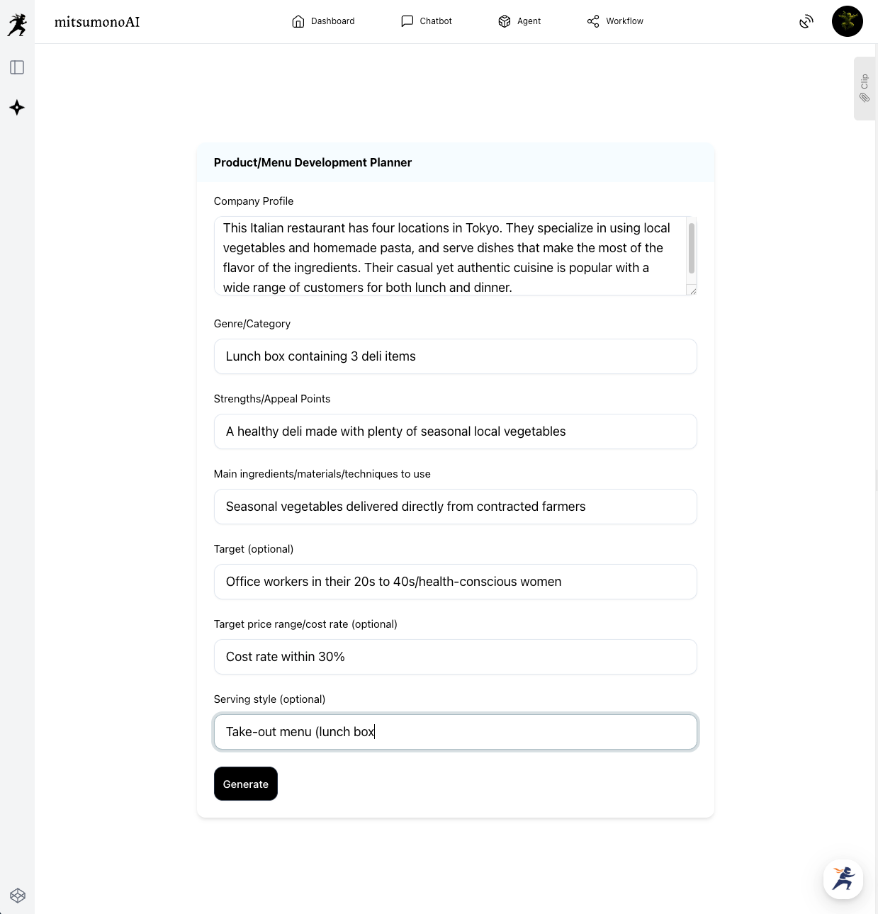 Next, input the information about the menu decided in Step 1 (Lunch Deli Box) into the "Product/Menu Development Planner," and click "Generate" to output the answer.