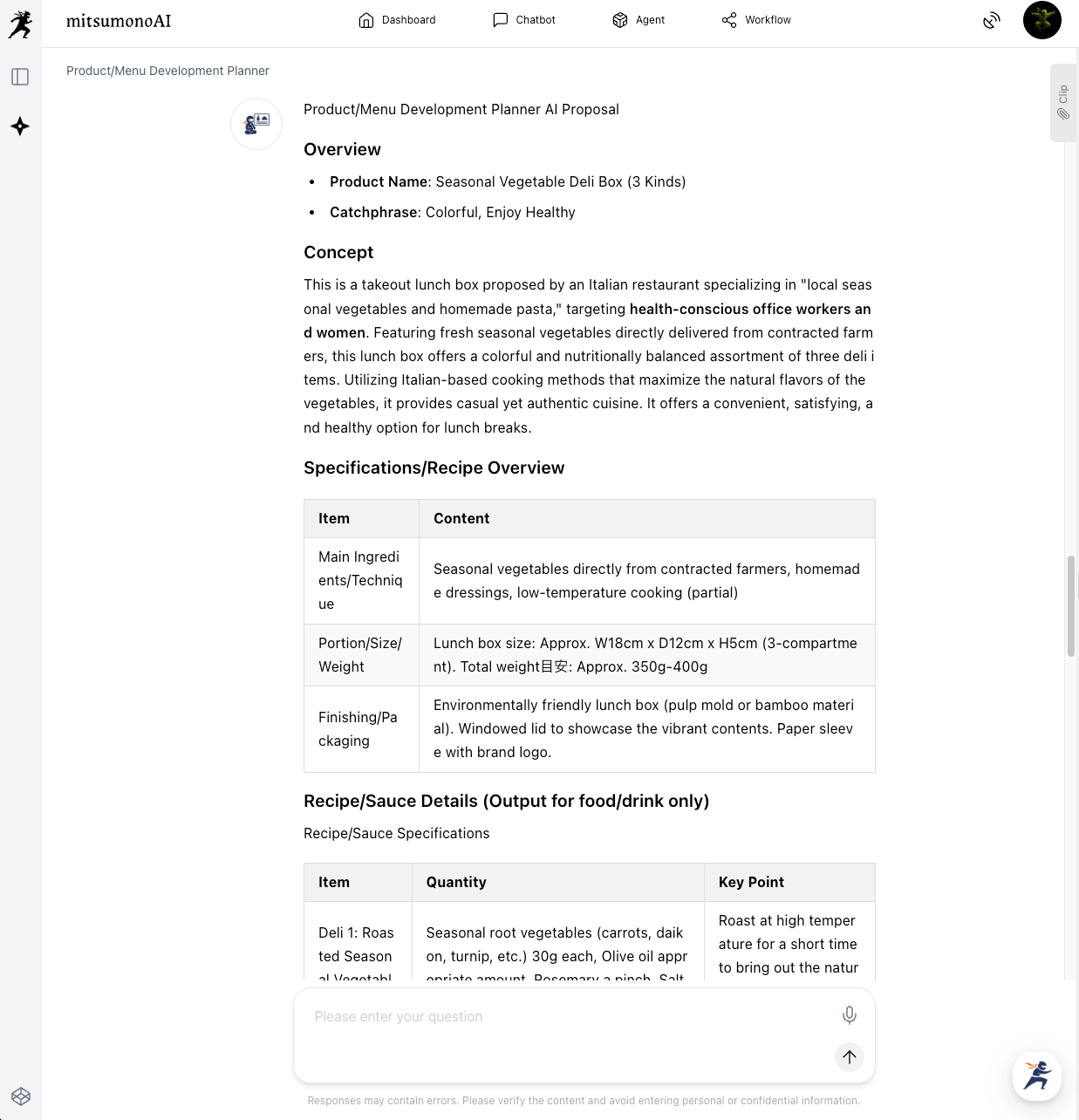 Based on the input information, the AI will propose the concept for the new lunch box, specific menu ideas, and the optimal price range for the target audience.