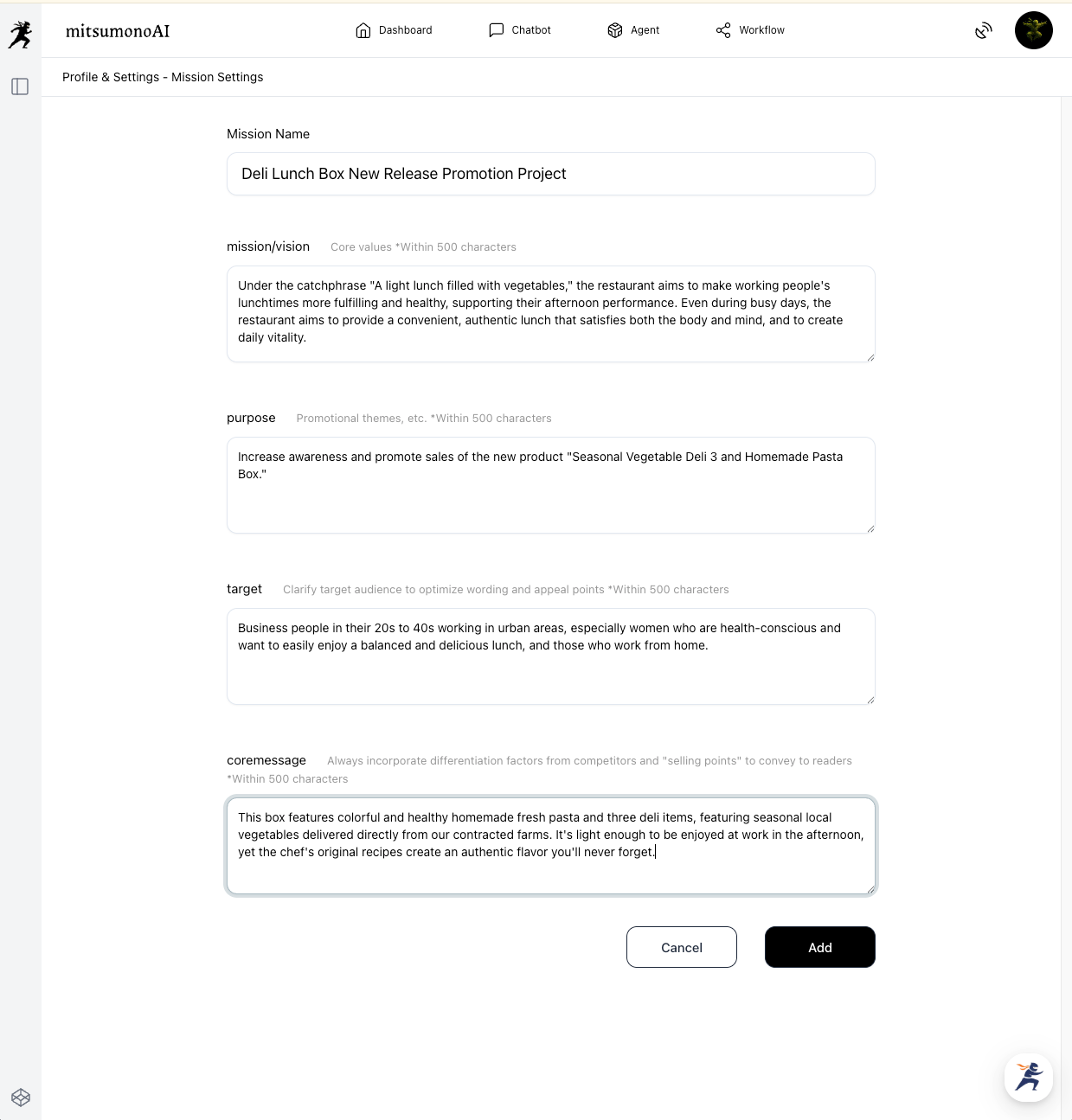 Register a mission for the promotional activities of the newly decided takeout menu, the "Lunch Deli Box (Pasta + 3 Deli Items)." This mission will serve as the core for formulating the SNS operations strategy in the next step.