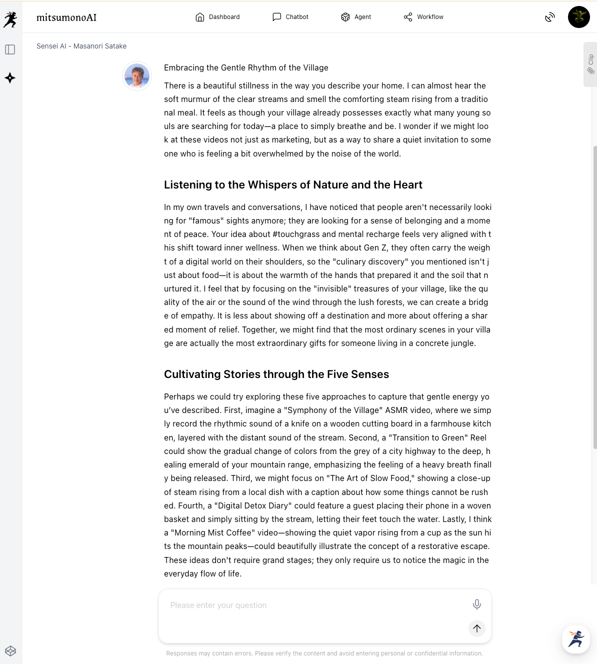 Through this step, the AI will identify the "invisible treasures" of your village—like the quality of the air or the sound of the wind—and propose specific, soul-stirring content ideas such as: