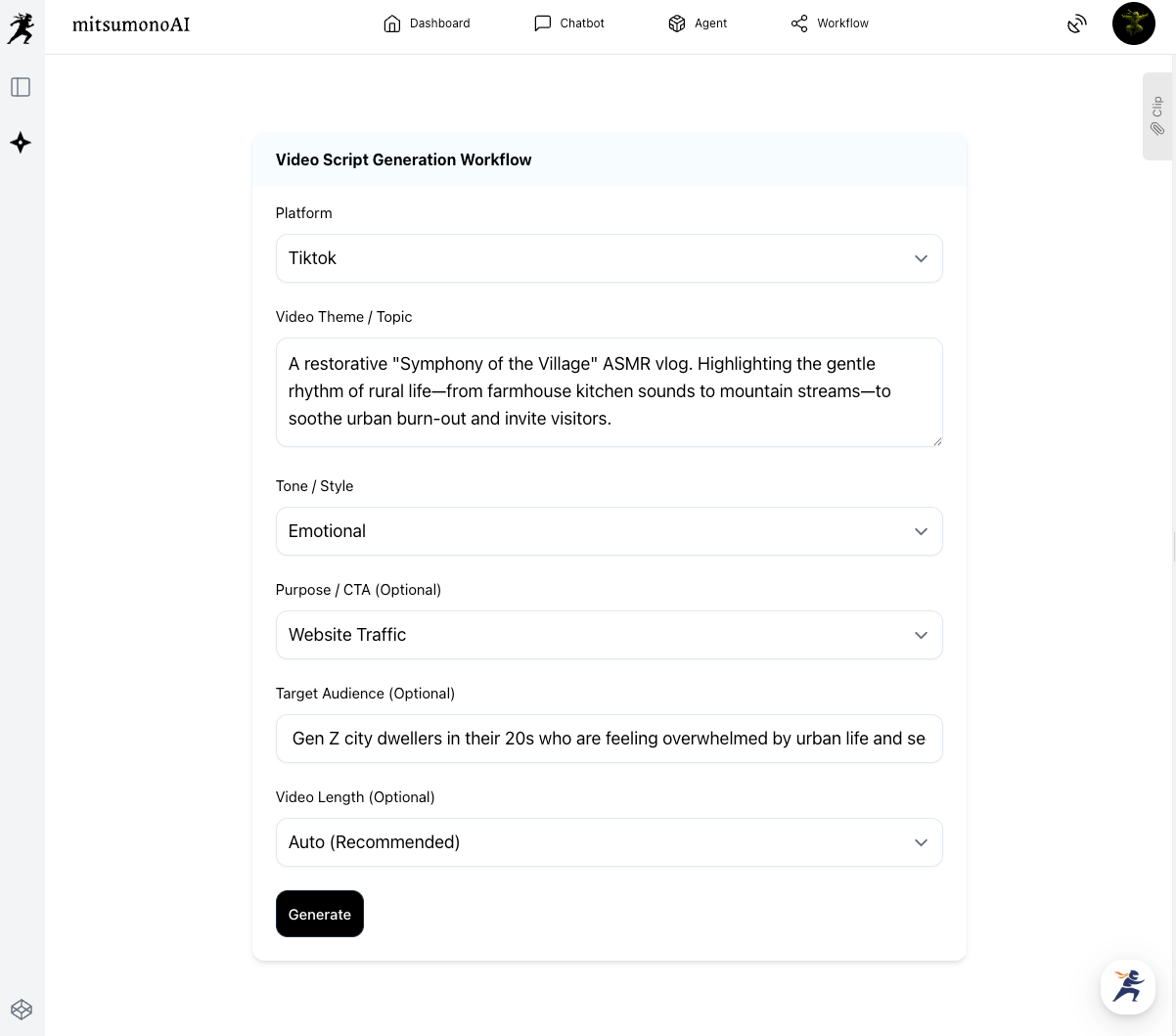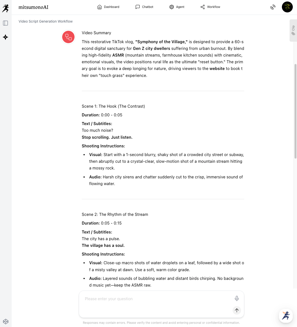 Finally, use the Video Script Generation Workflow to turn the core idea selected in Step 2 into a concrete script.