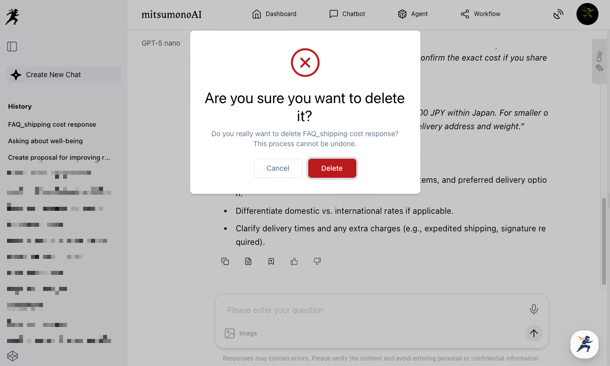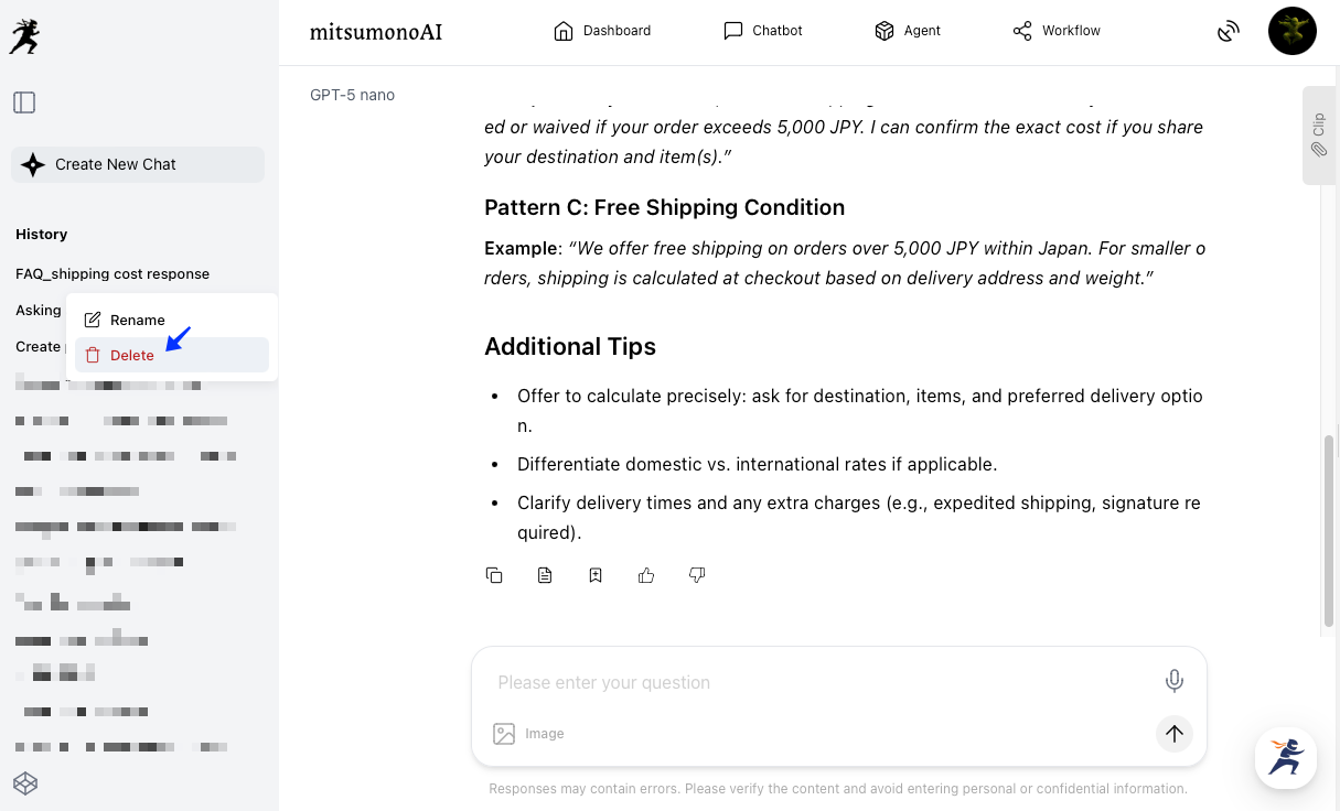 A notification reading "Chat history deleted" will be displayed. Verify that the corresponding history has been removed from the History List.