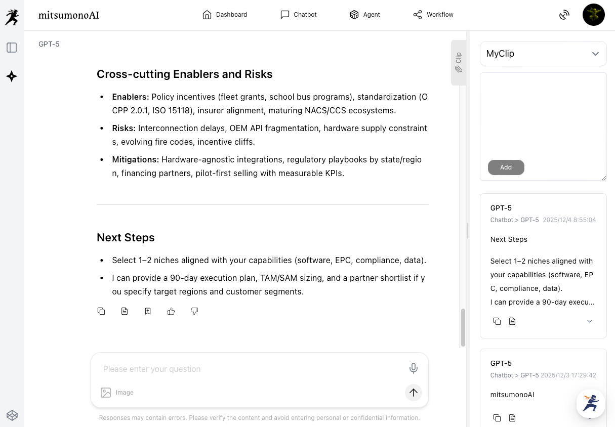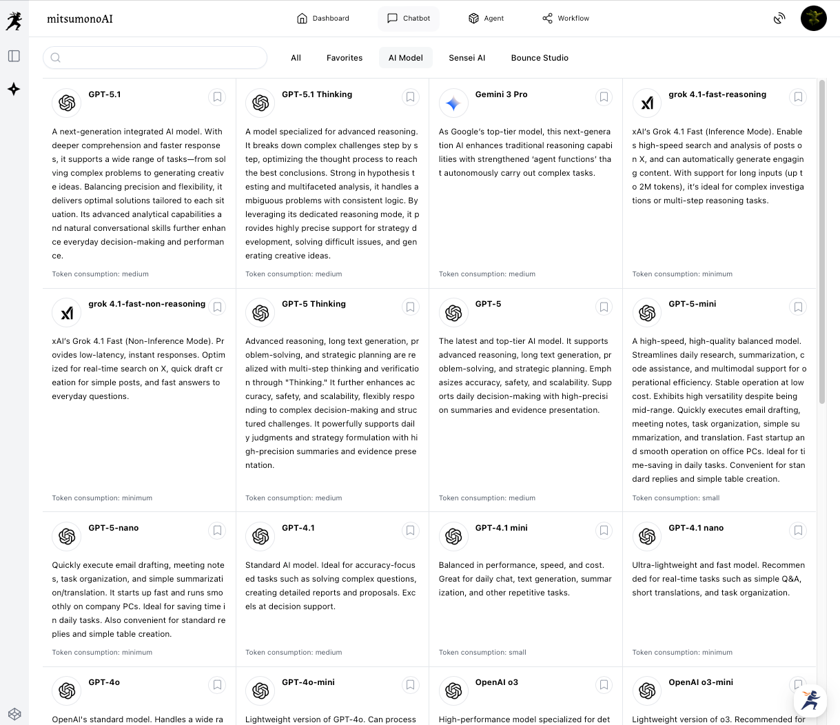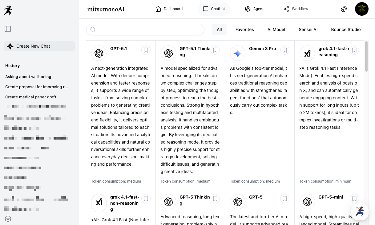 You can select and directly interact with world-leading generative AIs such as ChatGPT, Claude, and Gemini. AIs differ in their areas of expertise, speed, and cost. You can choose the optimal AI for your purpose.