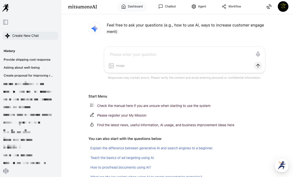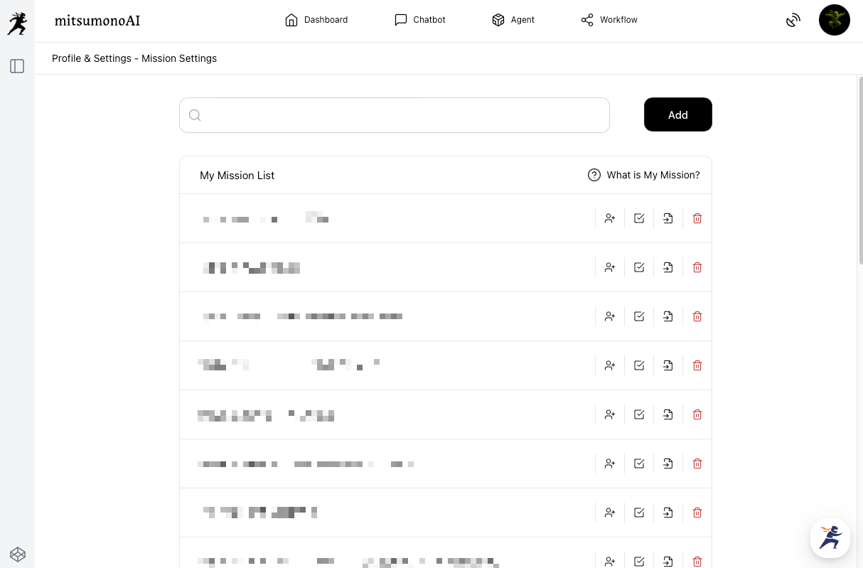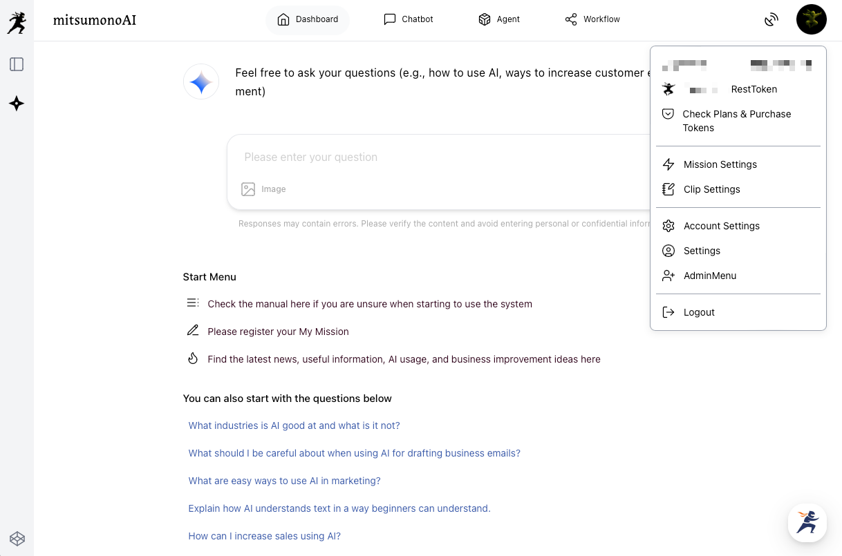 This manual explains how to use Login, Chat, Agent, and Workflow. It also covers the "My Mission" feature, which is essential for business efficiency, and tips for instructing the AI. Read this, and you will be able to master mitsumonoAI.