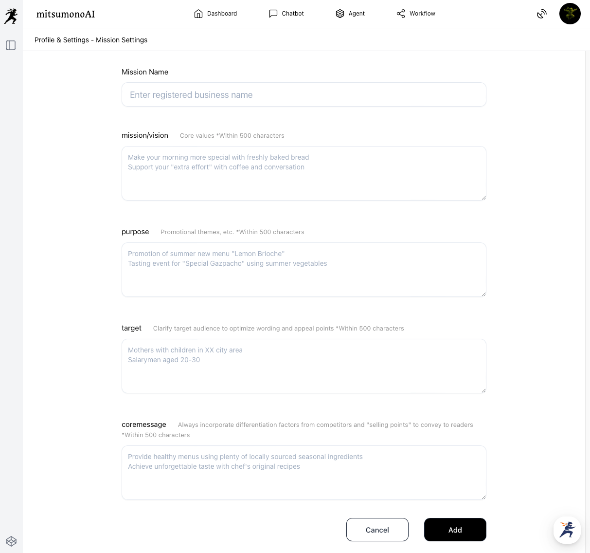 Register the details of your business or plan, referring to the displayed input examples. Once all input is complete, click the "Add" button in the lower right corner of the screen to save this mission.