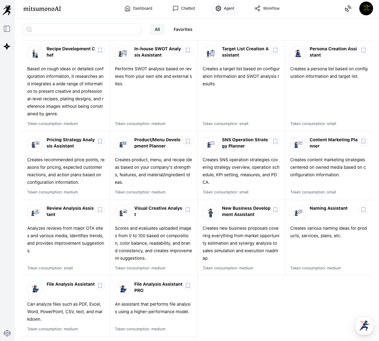 Agents handle various specialized business tasks, including marketing, planning, and analysis. Because they are optimized for each specific task, you can expect highly accurate output.