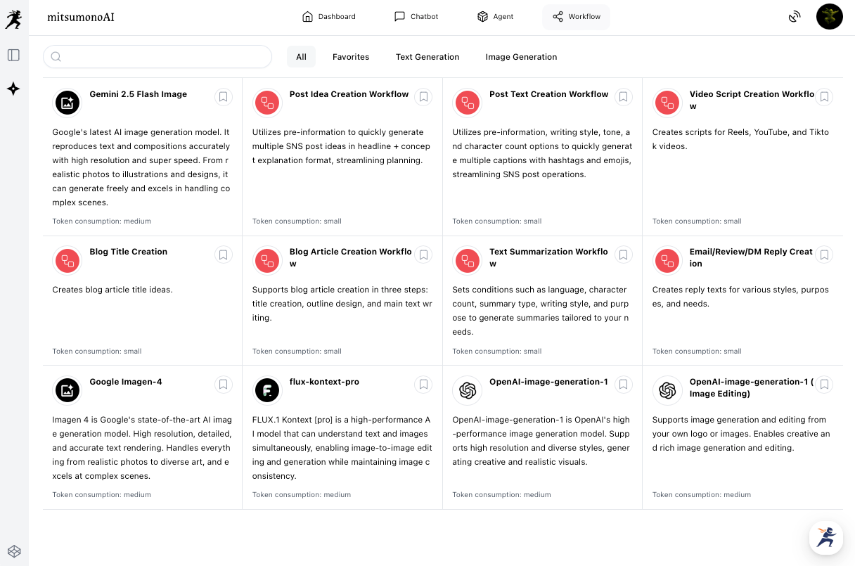 The "Workflow" feature efficiently executes document creation tasks that frequently occur in daily work, such as "creating blog articles" and "writing SNS posts."