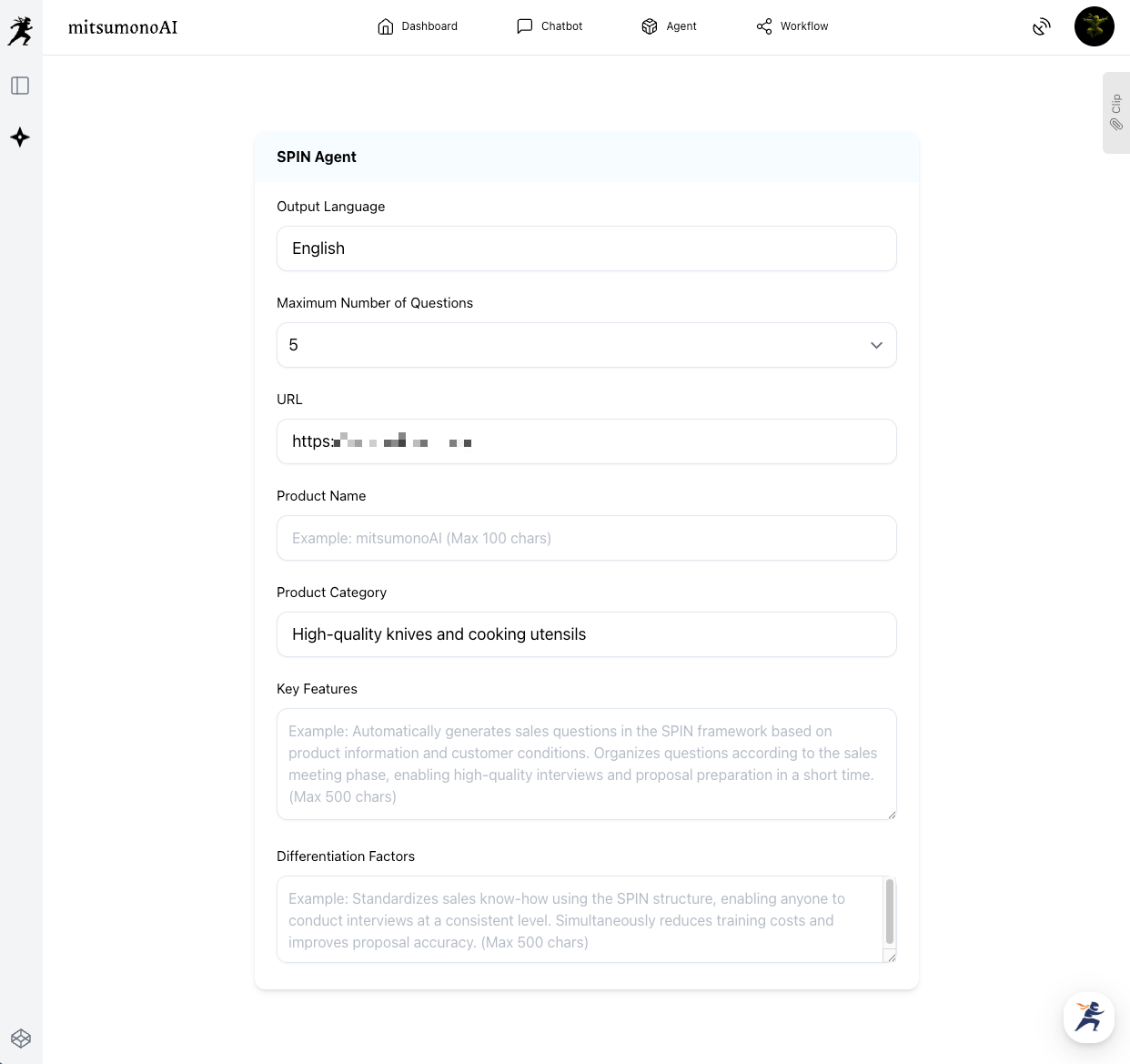 Access the SPIN Agent screen and input the relevant product information. By loading the product URL directly or entering a detailed text summary, the AI generates questions based on the SPIN methodology.