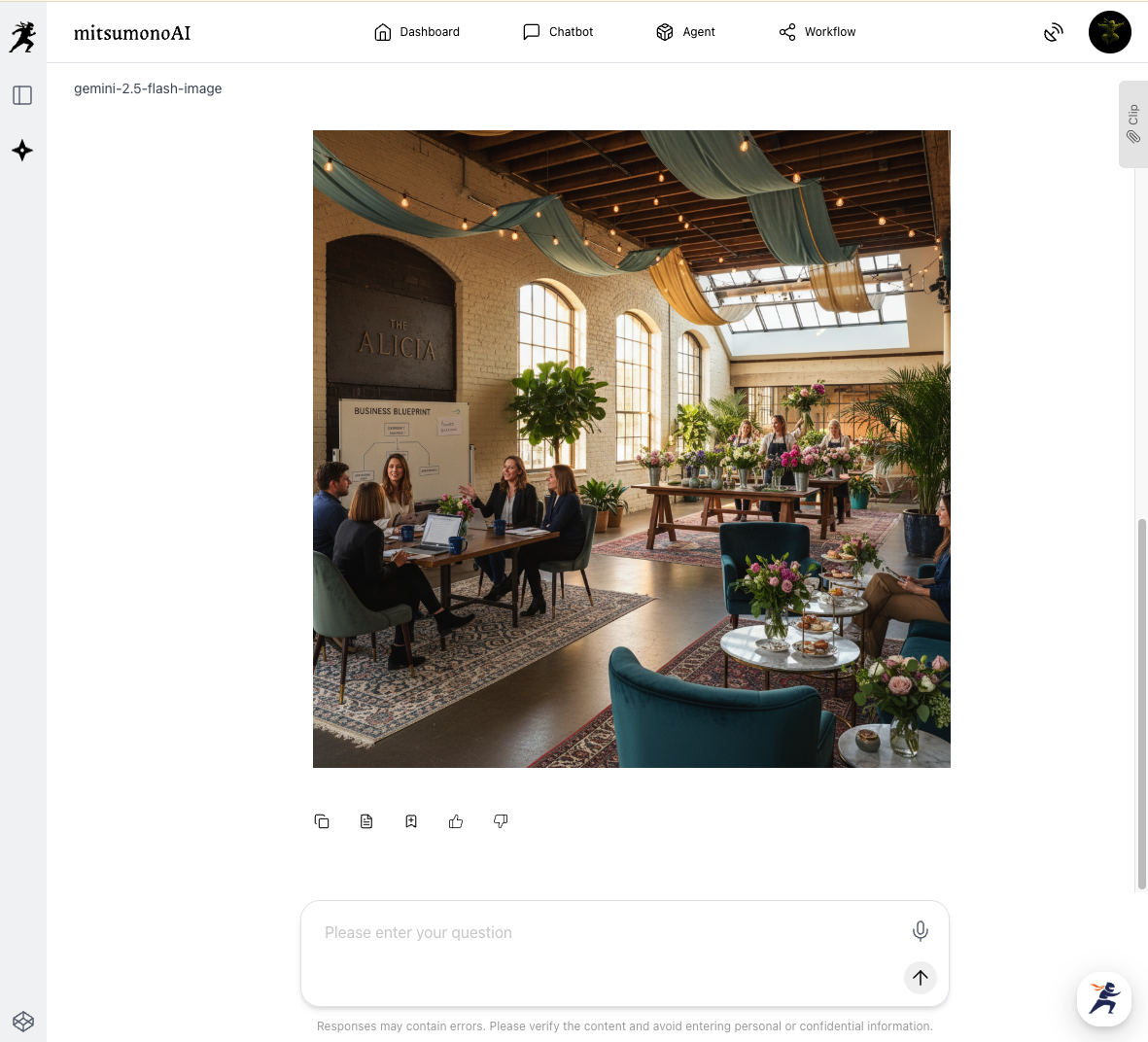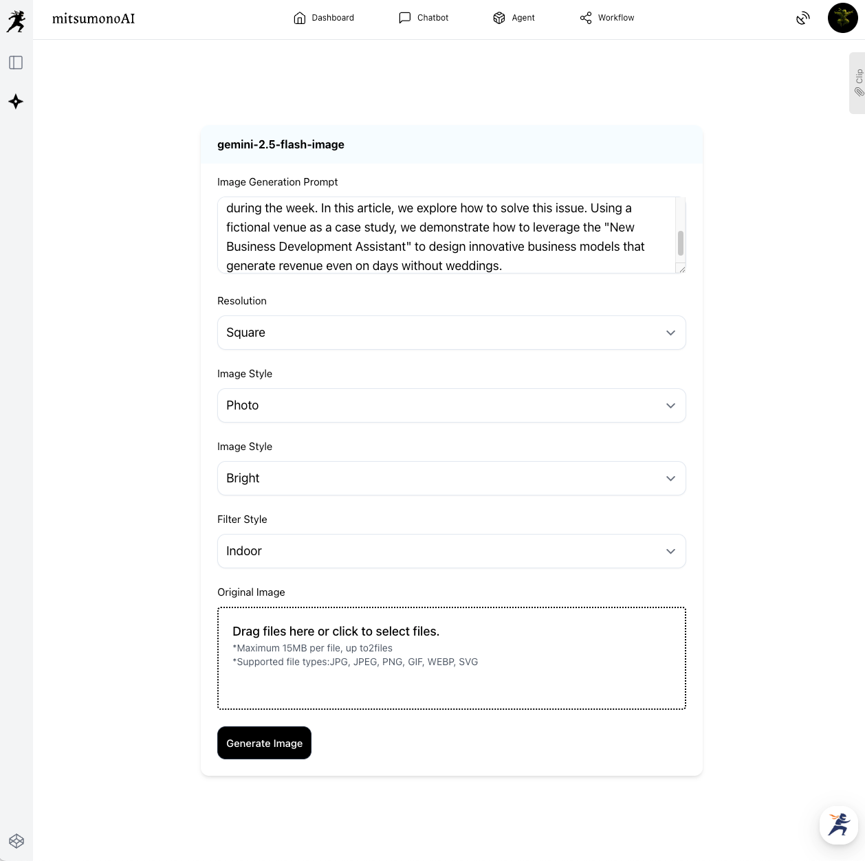 Launch "gemini-2.5-flash-image" from the mitsumonoAI workflow. Paste the text you just copied into "Image Generation Text." Since we want to express the facility's high-quality and calm atmosphere this time, we selected "Photo" from "Image Style" and "Bright" from "Image Mood." With just this, the AI grasps the concrete image of "a photo of a bright facility on a day without weddings" and begins preparation for generation.