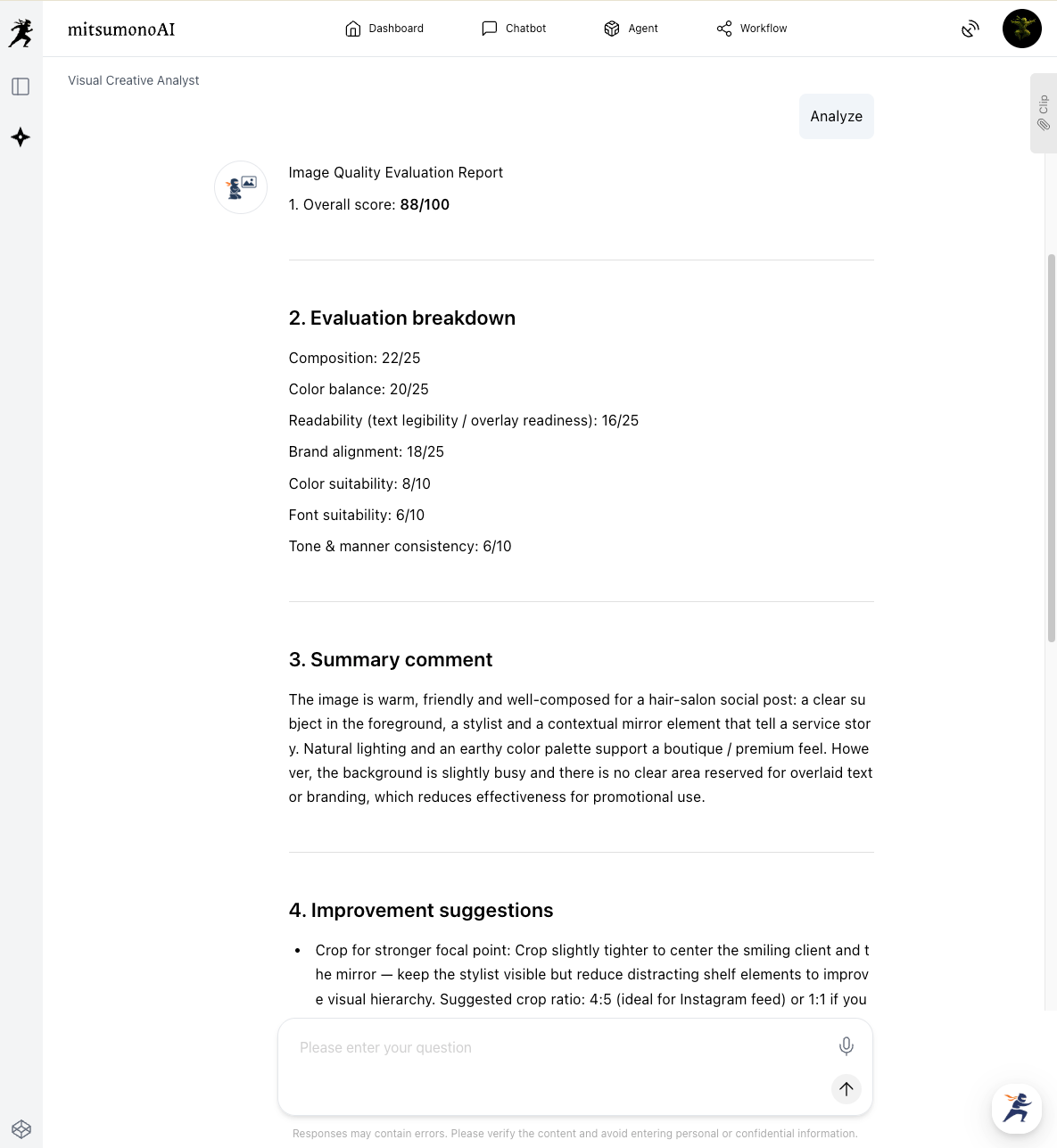 First, have the AI objectively evaluate whether the photo meets the basic quality standards of a "good photo." The first step is to obtain data-driven scores and specific improvement suggestions, rather than relying on a subjective "good/bad" feeling. Simply uploading the photo to the Visual Creative Analyst allows the AI to instantly analyze it from multiple perspectives, such as composition, color balance, readability, and brand consistency.