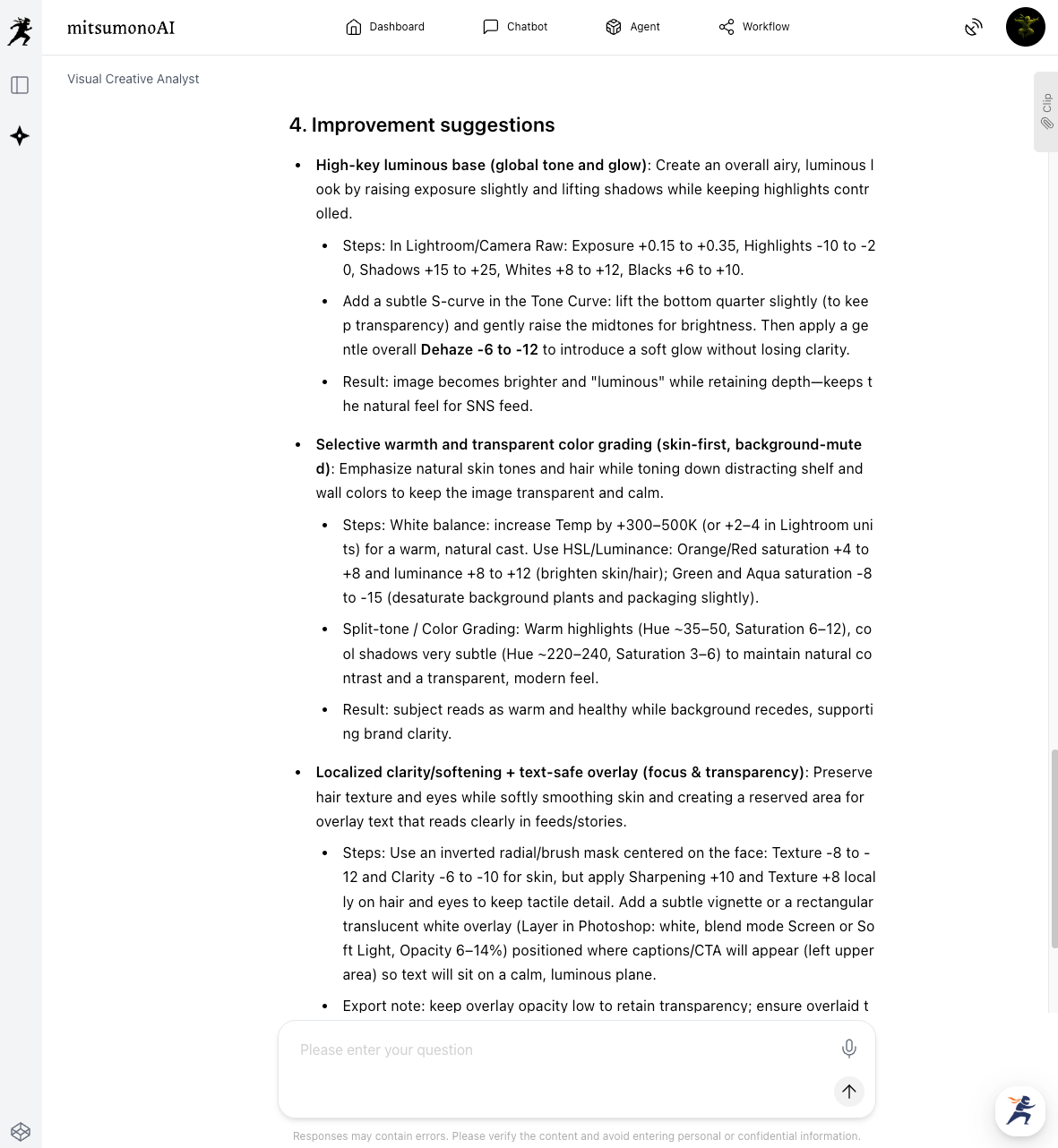 Based on the basic quality assessment, the next step is to elicit deeper suggestions for improving the photo to align it with the company's target "brand image," through dialogue with the AI. After the Step 1 assessment results are generated, you can send additional instructions in a chat format.
