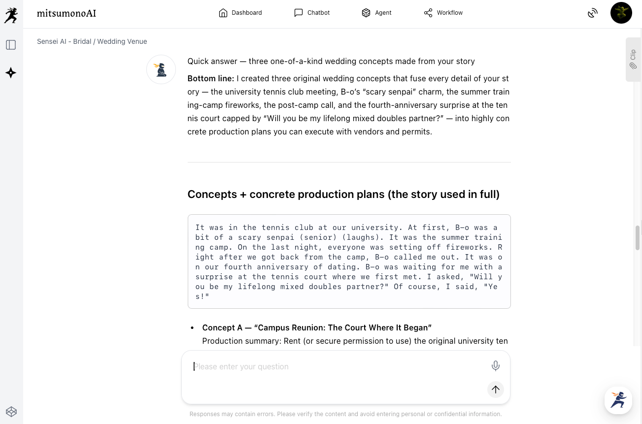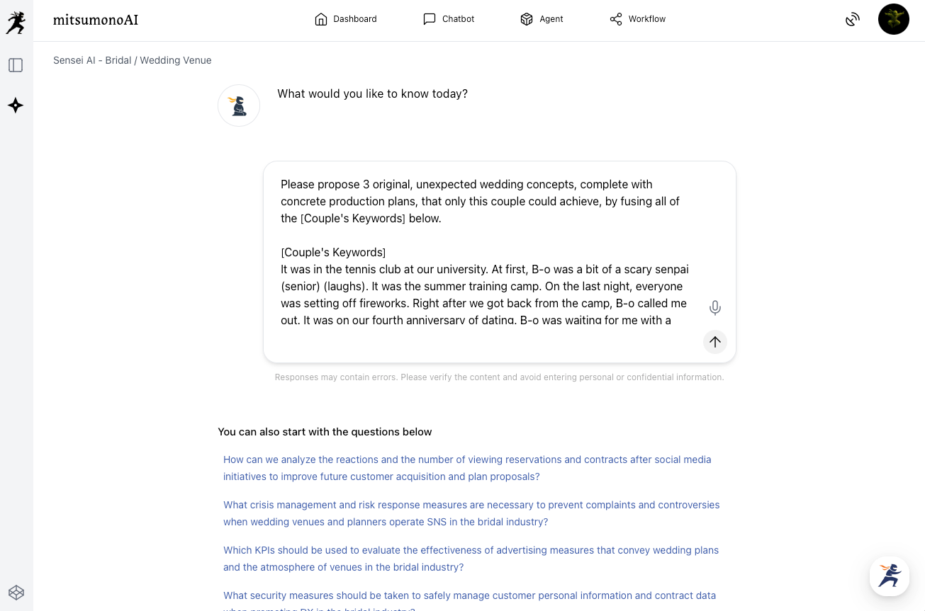 Next, based on the keywords extracted and organized in Step 1, use Sensei AI - Bridal & Wedding Venue, which specializes in the bridal industry, to create specific concept proposals.