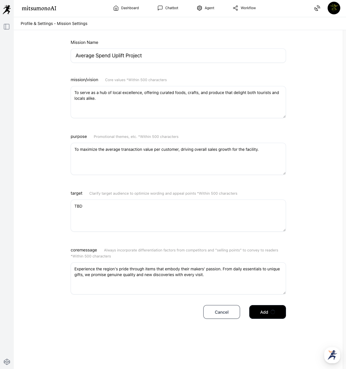This mission sets the project goals, vision, and core message. Since the target is not yet clear at this stage, register the "Target" field as "Undecided" for now.