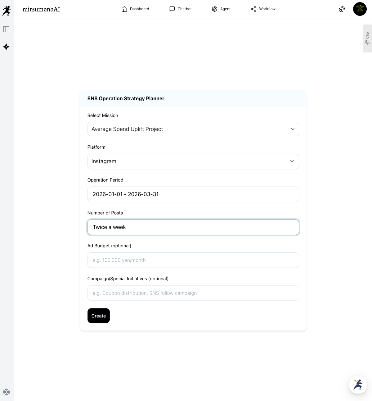 Input the designated items into the "SNS Operation Strategy Planner." The target information is already included in the mission. Input the platform to be used, the operation period, and the realistically executable number of posts, and then create the plan.