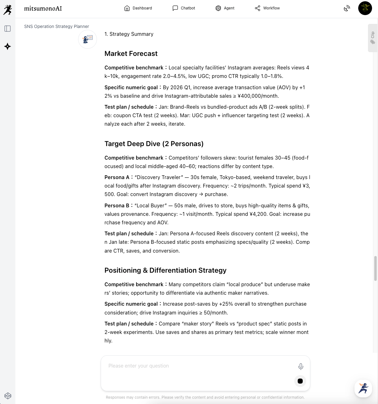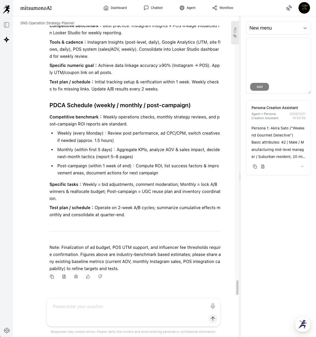 By providing the persona information created in Step 4 (e.g., details about Akira Sato (“Weekend Gourmet Detective”)) here, you can create a specific and realistically executable SNS operation plan that enhances appeal to the target audience.