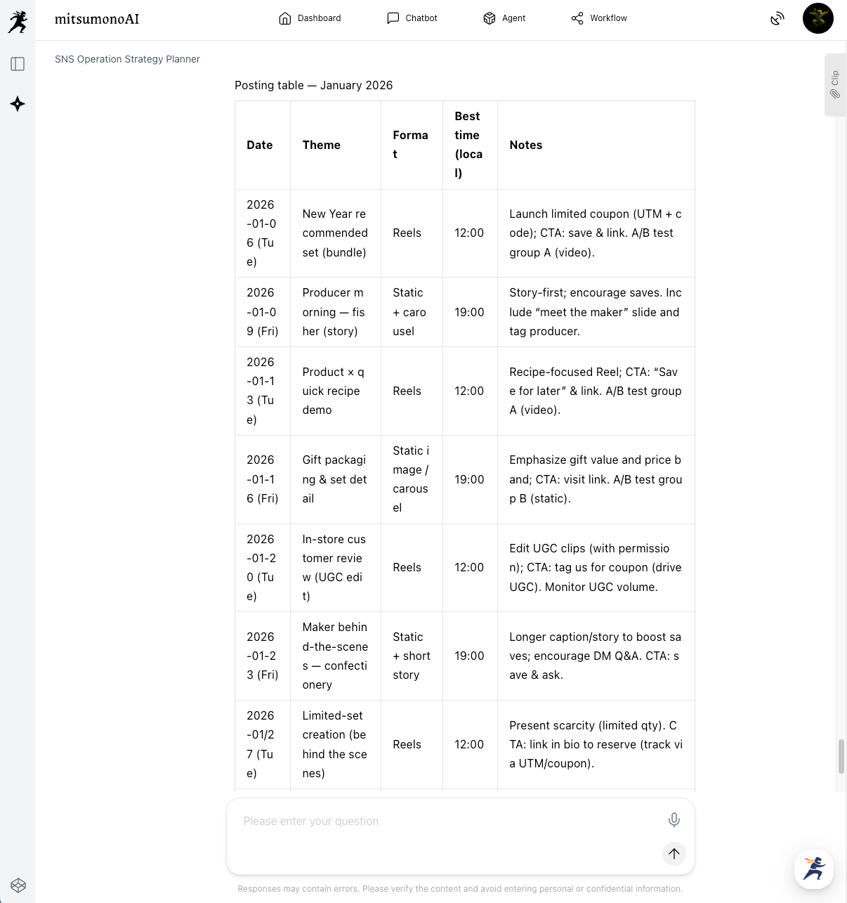 Then, by instructing the AI to "Create the posting schedule for January 2026," it can output the optimal content themes and schedule for the persona. Clearly defining the purpose, target, and content of SNS operation enables the identification of what and when to post, ensuring planned and continuous posting.